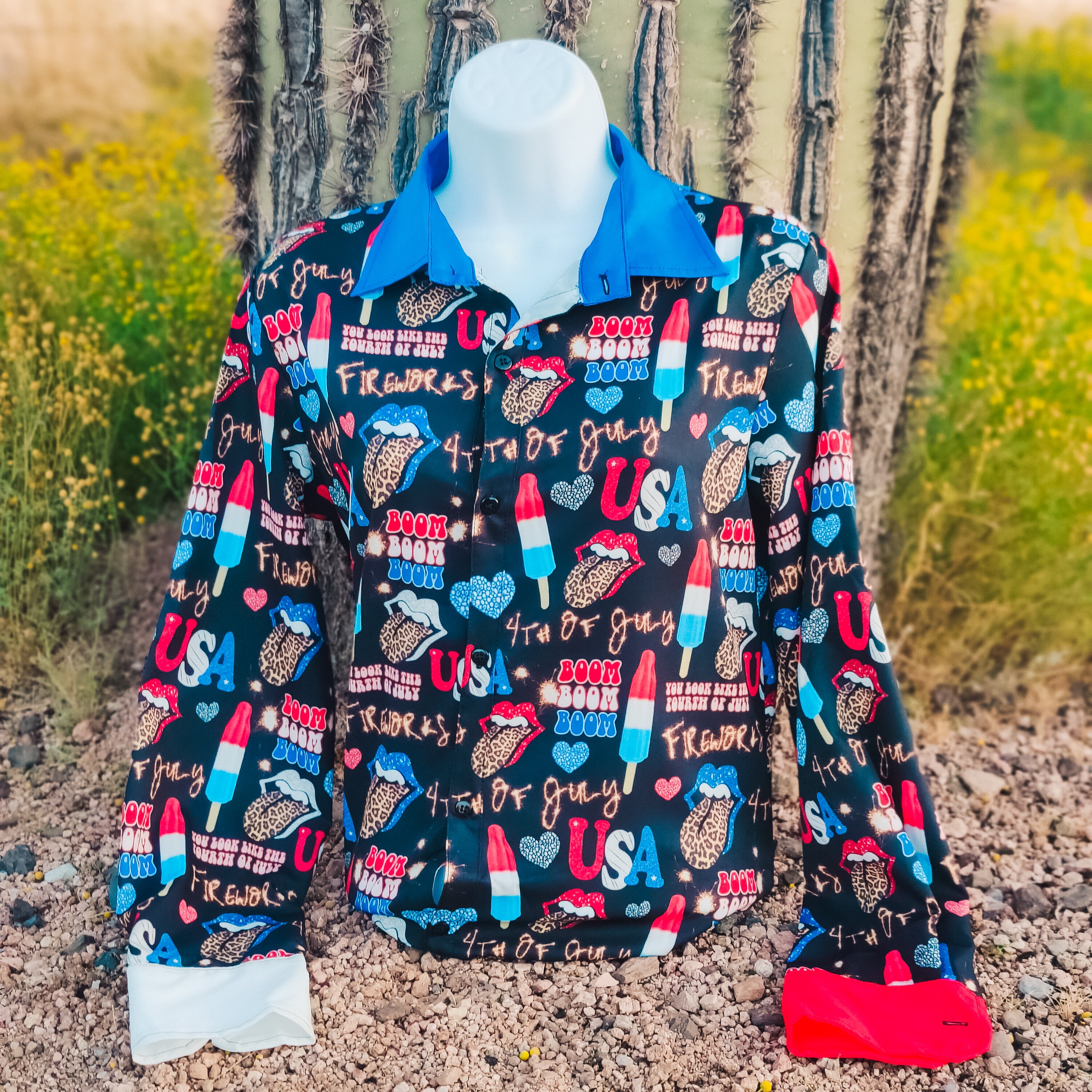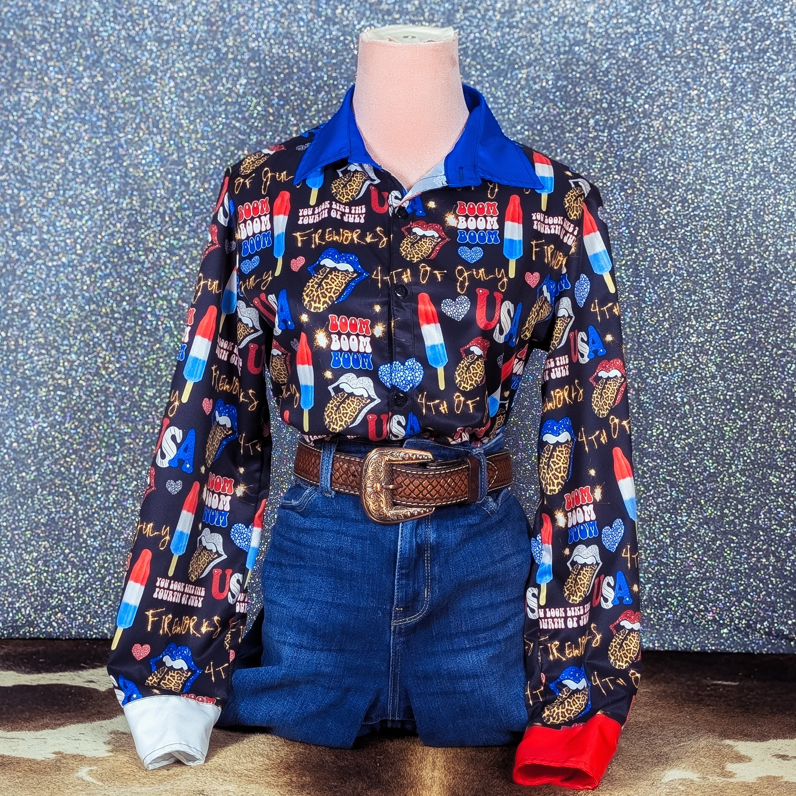 Cue the fireworks because this shirt is louder than a Fourth of July finale and twice as fabulous! Decked out in red, white, and boom, Boom Boom Pop brings the party with a bold prints that has enough sass to make Uncle Sam blush. This shirt is for the cowgirl that's all about star-spangled chaos (in the very best way of course). Whether you’re lighting sparklers or just lighting up the arena, this shirt says, “Land of the Free, Home of the Amazing.” You bring the attitude. We’ll bring the boom.