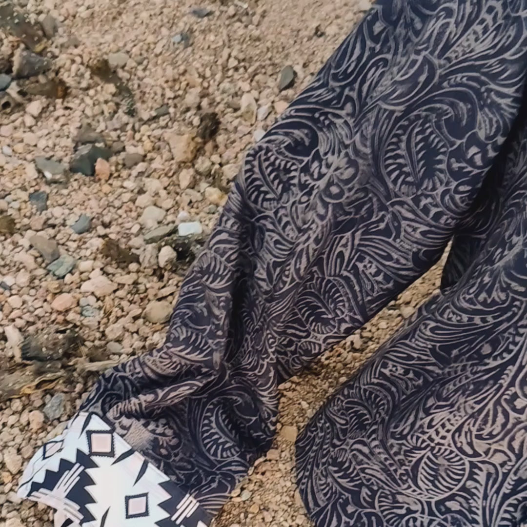 Tooled leather and aztec are to cowgirls like peanut butter is to jelly. They just make sense together. Which is why we paired this fun black leather print button down with bold aztec cuffs for a classy, showstopping look that is sure to make people go "oh wow" as you walk by.