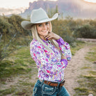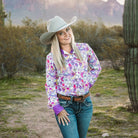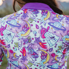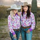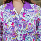 Alien abduction looks like fun with our Cosmic Cowgirl Button Down. A bold purple and turquoise background swirl behind a cheeky hand drawn pattern. Bright purple cuffs and collar make this look really pop.