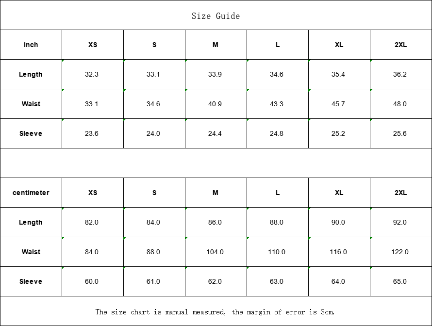 | Waist | 33.1 | 34.6 | 40.9 | 43.3 | 45.7 | 48.0 |