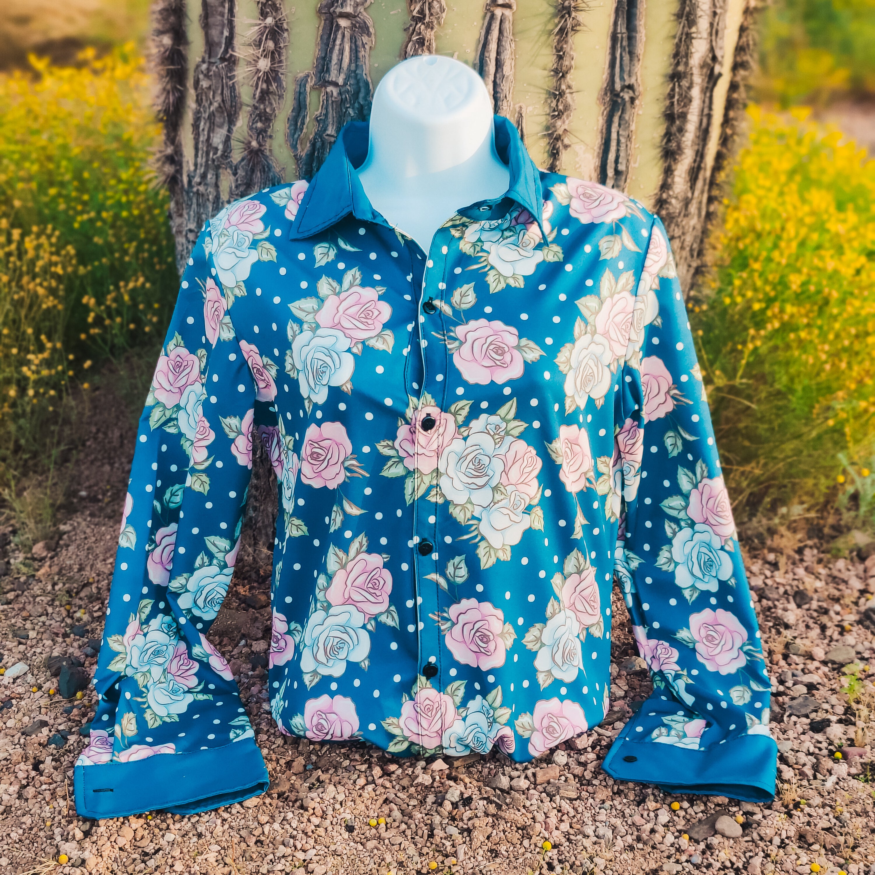 Why are our TGC button downs a must have? Not only are they bold and unique, just like you, but they are also extremely comfortable. They are made out of a lightweight, breathable stretch satin that is comfortable to wear year round and feels like wearing a pajama top. The subtle sheen makes it gorgeous in photos without the fabric looking cheap and shiny. We included extra length in the body so it always stays tucked regardless of your torso length and how far forward you move your arms when pushing your horse home or throwing a rope.