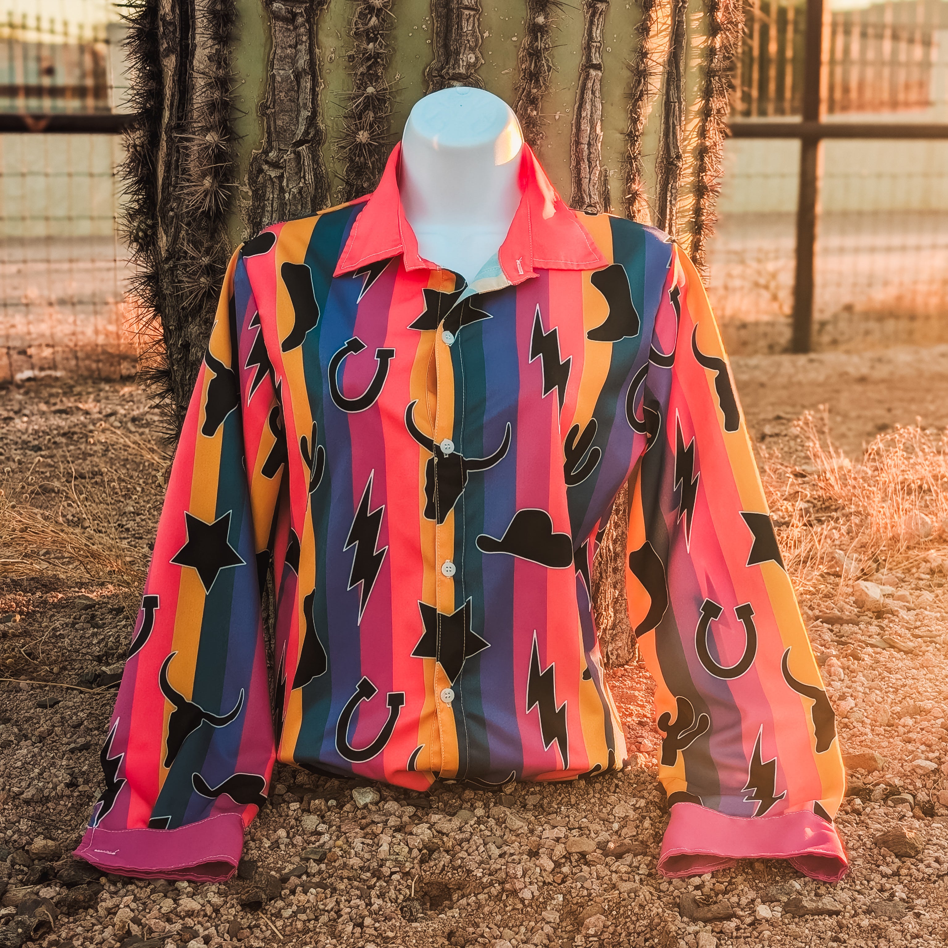 Why are our TGC button downs a must have? Not only are they bold and unique, just like you, but they are also extremely comfortable. They are made out of a lightweight, breathable stretch satin that is comfortable to wear year round and feels like wearing a pajama top. The subtle sheen makes it gorgeous in photos without the fabric looking cheap and shiny. We included extra length in the body so it always stays tucked regardless of your torso length and how far forward you move your arms when pushing your horse home or throwing a rope.