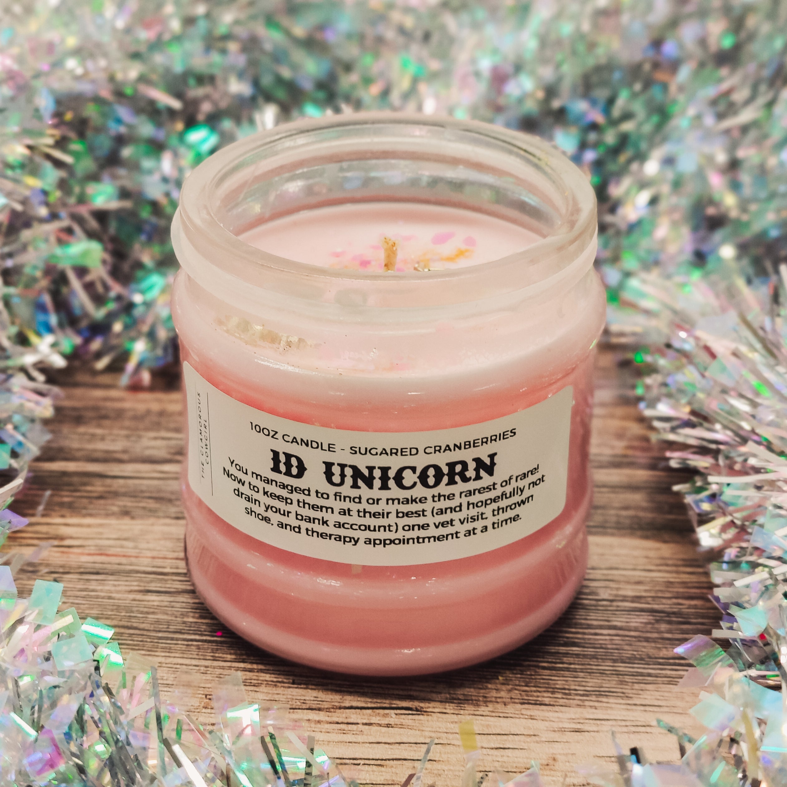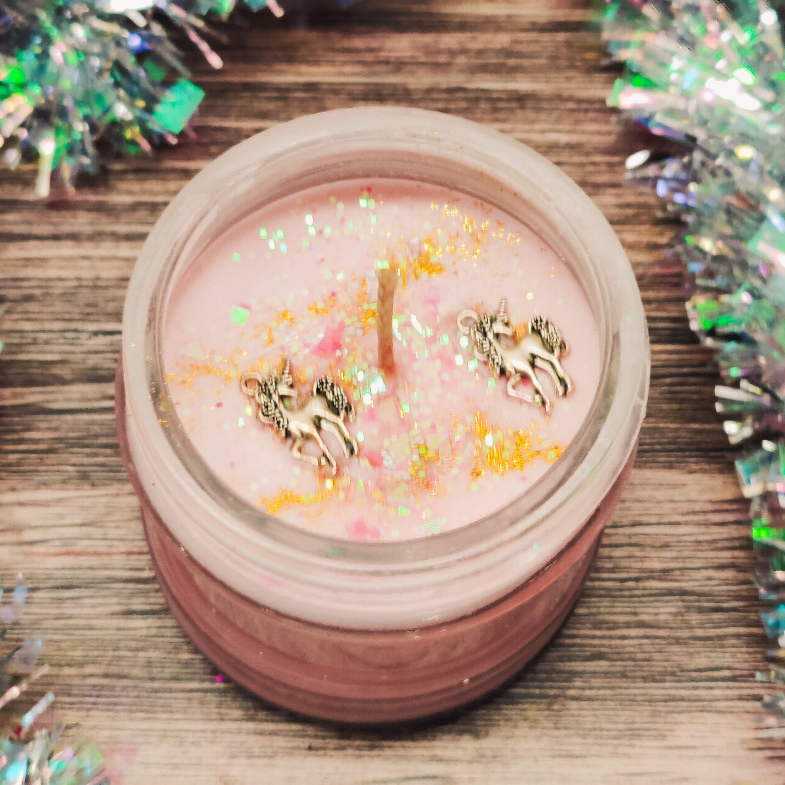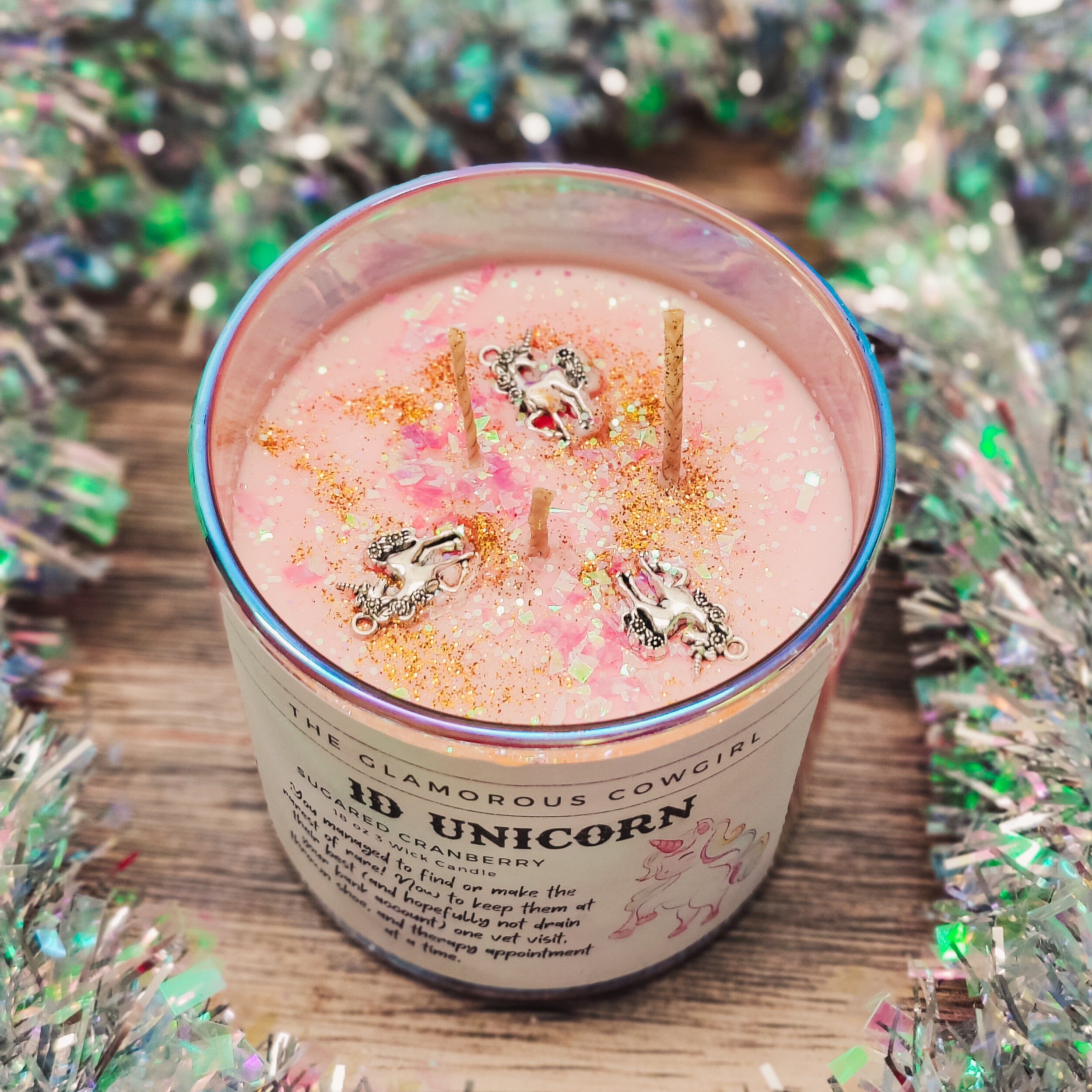 1D Unicorn is a baby pink colored candle topped with iridescent glitter, gold flakes, raspberry pink glitter, and unicorn charms for a beautiful, girly candle. Cranberry and vanilla sugar give a cotton candy-esque scent that's sweet without being cloying or overpowering.