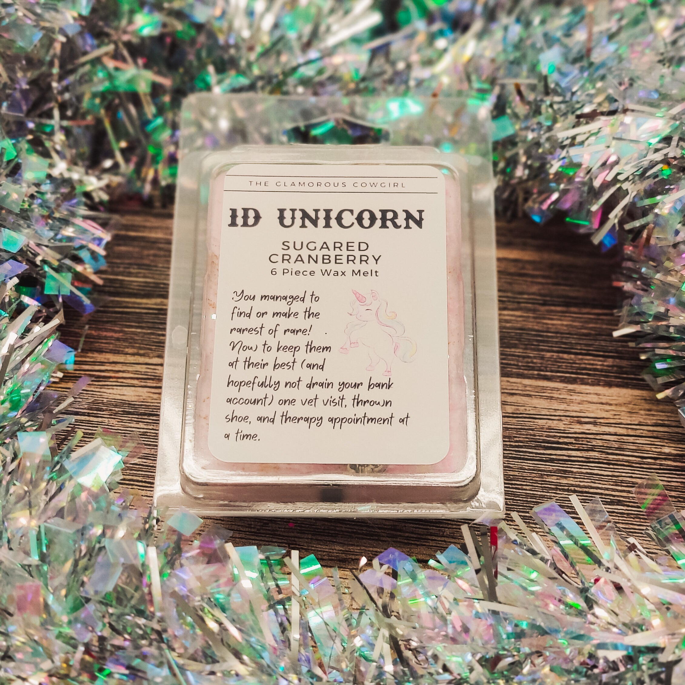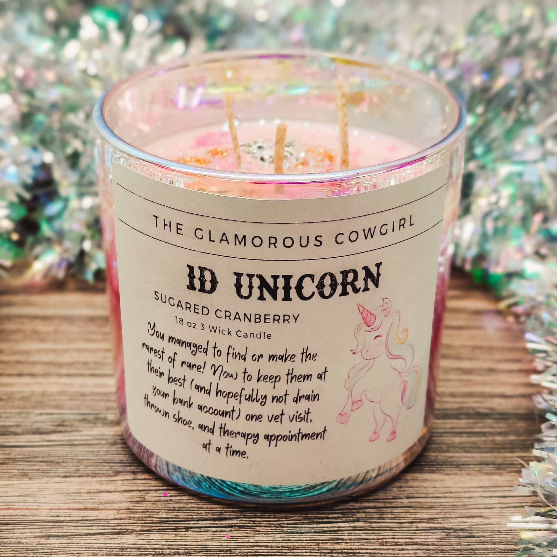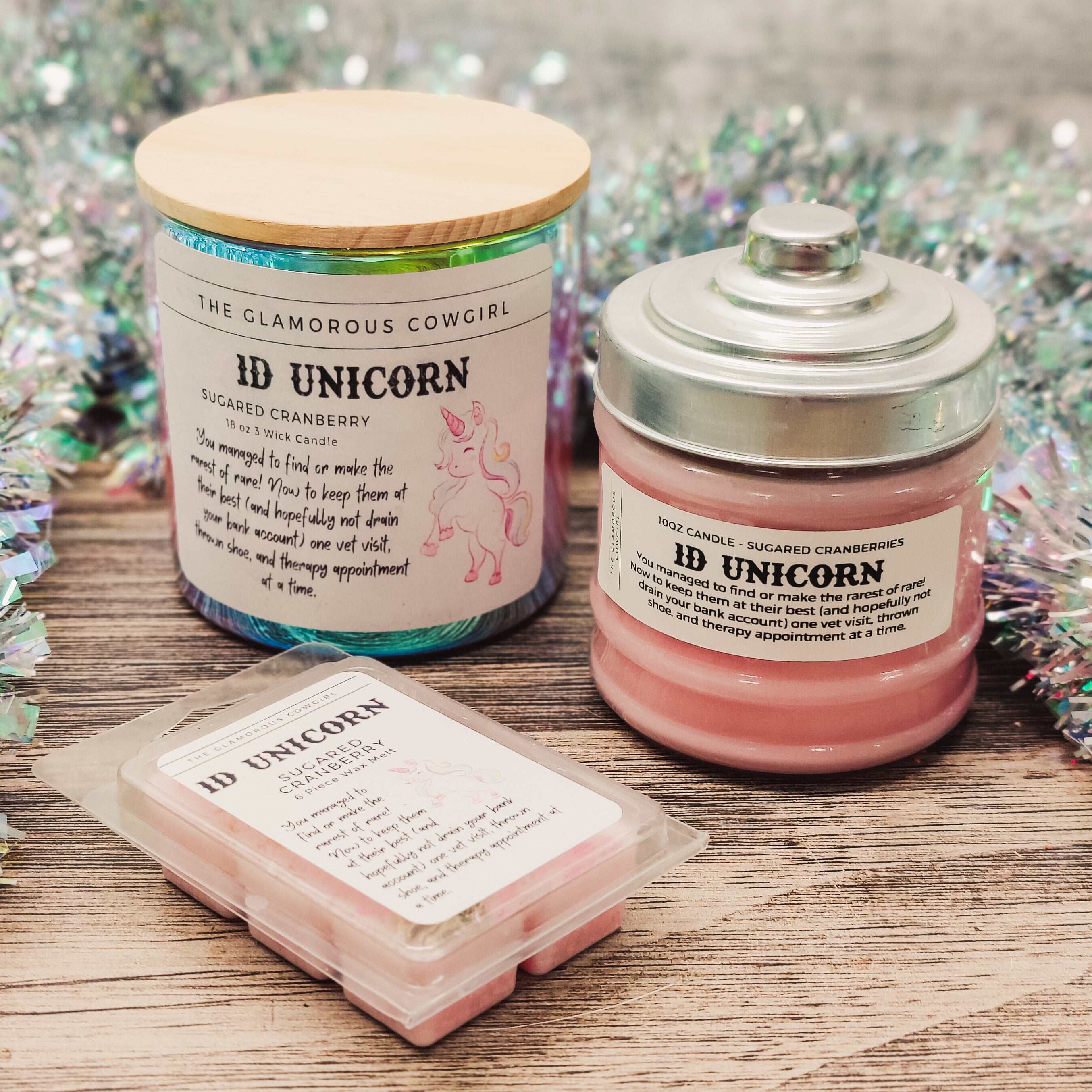 1D Unicorn is a baby pink colored candle topped with iridescent glitter, gold flakes, raspberry pink glitter, and unicorn charms for a beautiful, girly candle. Cranberry and vanilla sugar give a cotton candy-esque scent that's sweet without being cloying or overpowering.