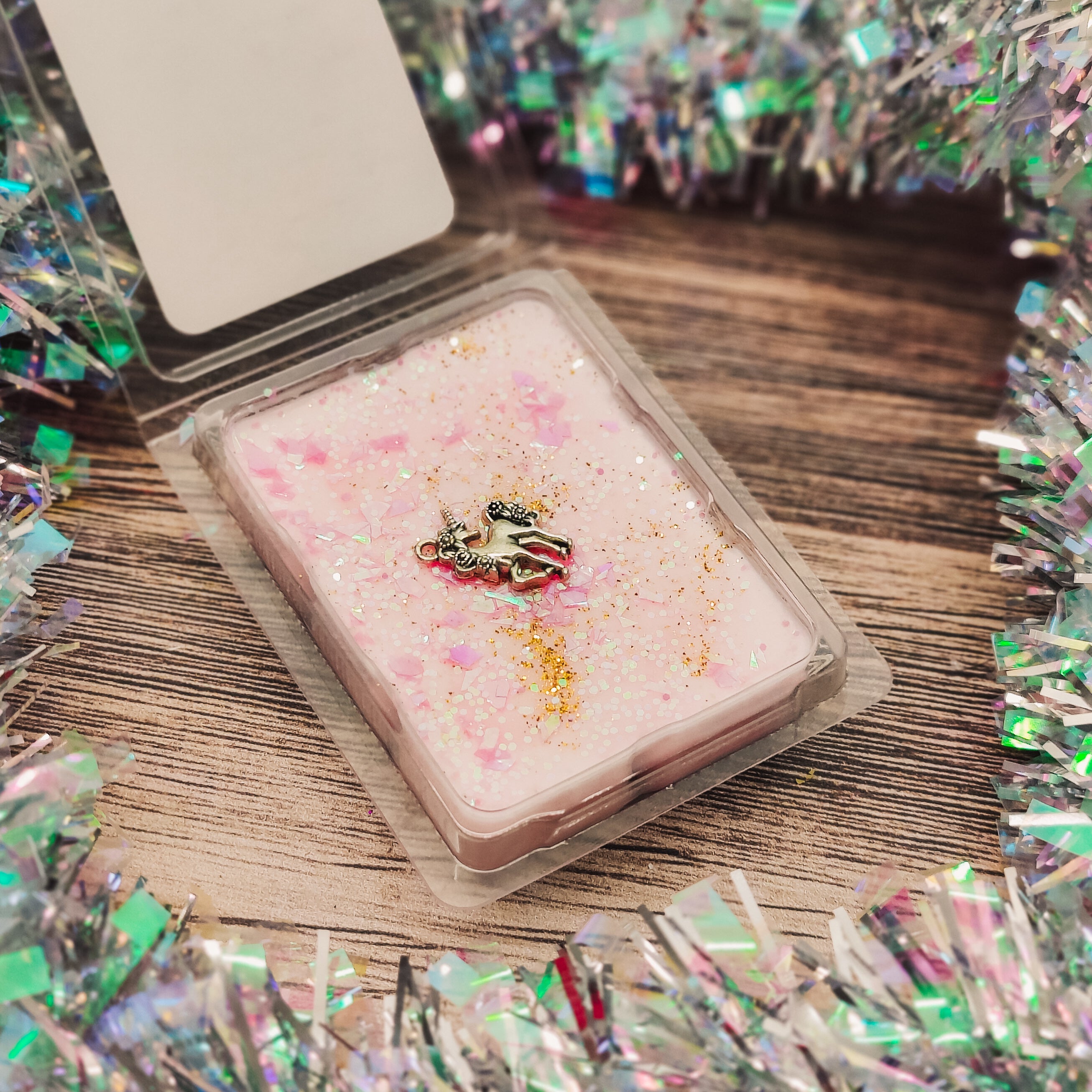 - Hand poured soy coconut wax blend topped with glitter and charms