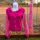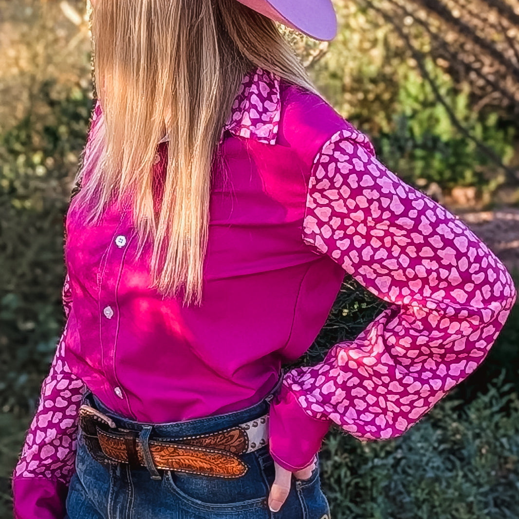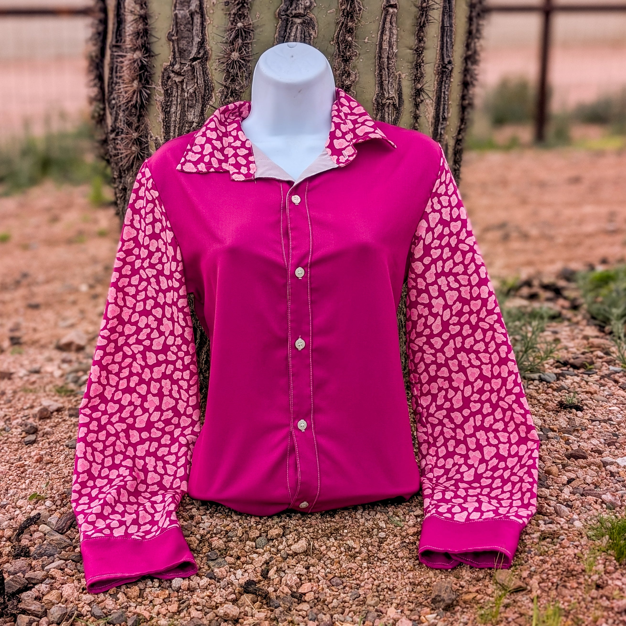 Why are our TGC button downs a must have? Not only are they bold and unique, just like you, but they are also extremely comfortable. They are made out of a lightweight, breathable stretch satin that is comfortable to wear year round and feels like wearing a pajama top. The subtle sheen makes it gorgeous in photos without the fabric looking cheap and shiny. We included extra length in the body so it always stays tucked regardless of your torso length and how far forward you move your arms when pushing your horse home or throwing a rope.
