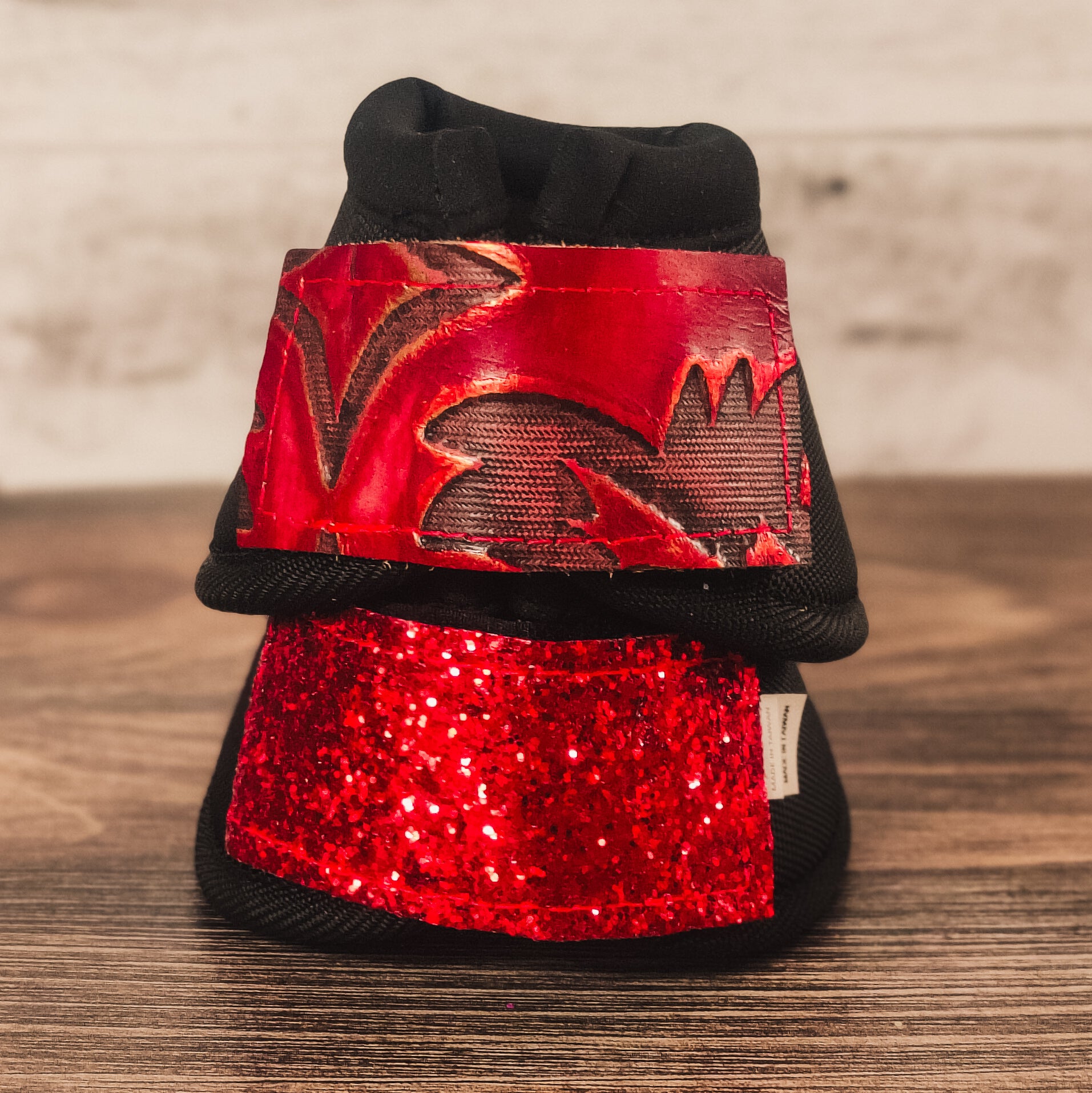 Medium Black Iconoclast Bells w/ Red Filigree Leather and Red Glitter Straps