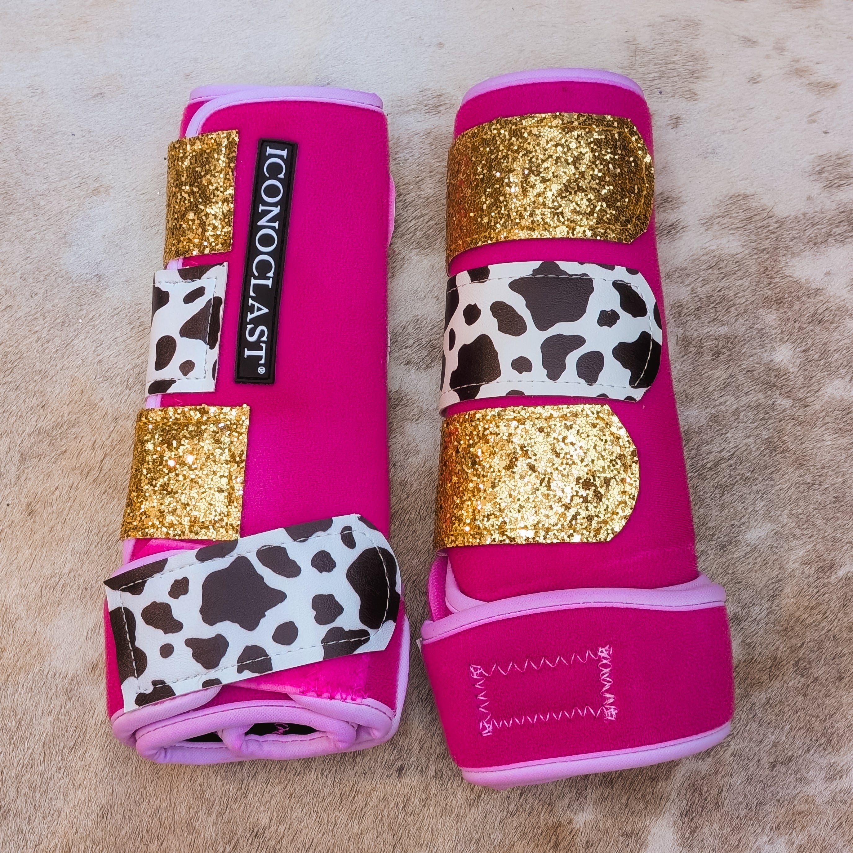Medium Pink Dyed Iconoclast Fronts w/ Cowprint and Gold Glitter Straps