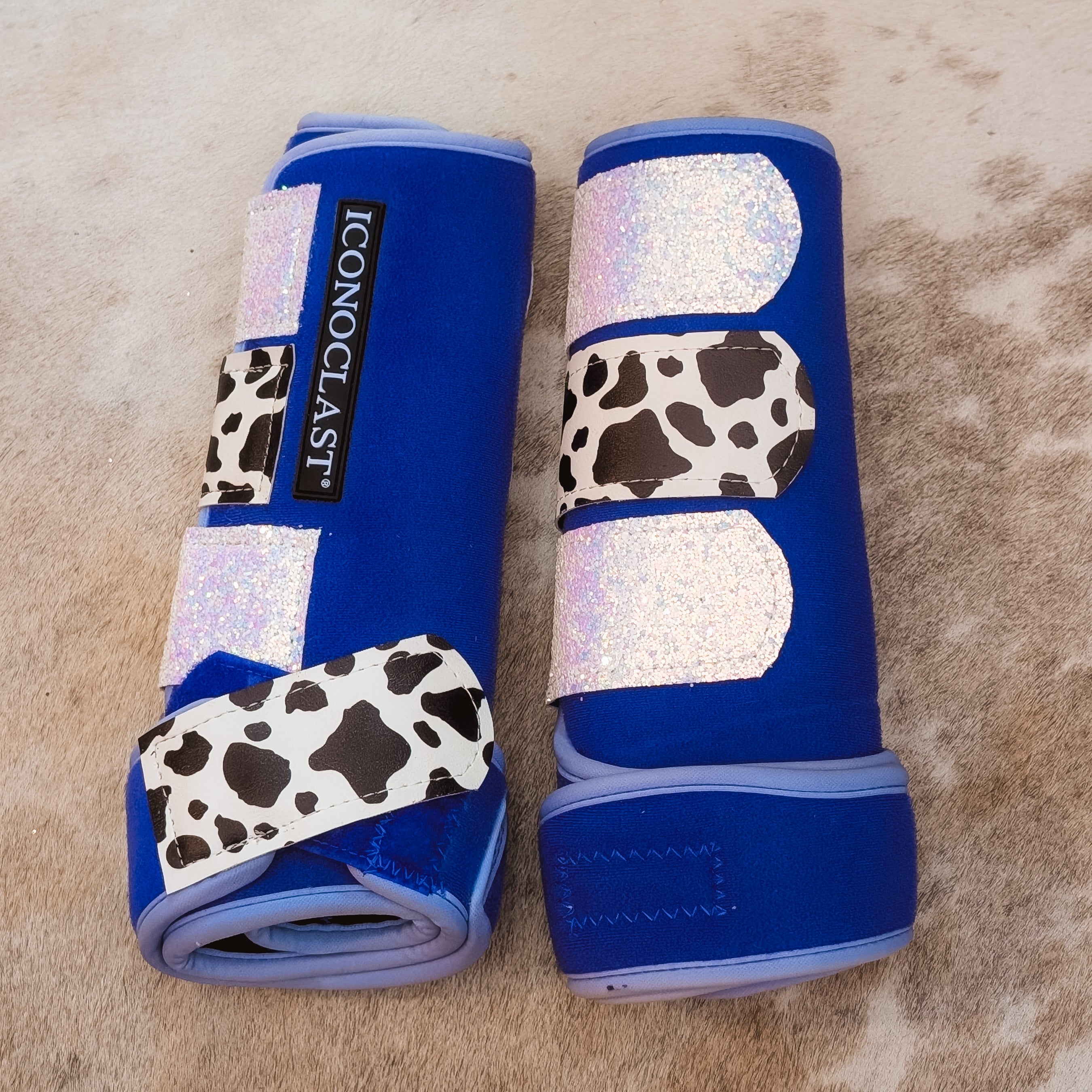 Large Blue Dyed Iconoclast Fronts w/ Cowprint and White Glitter Straps