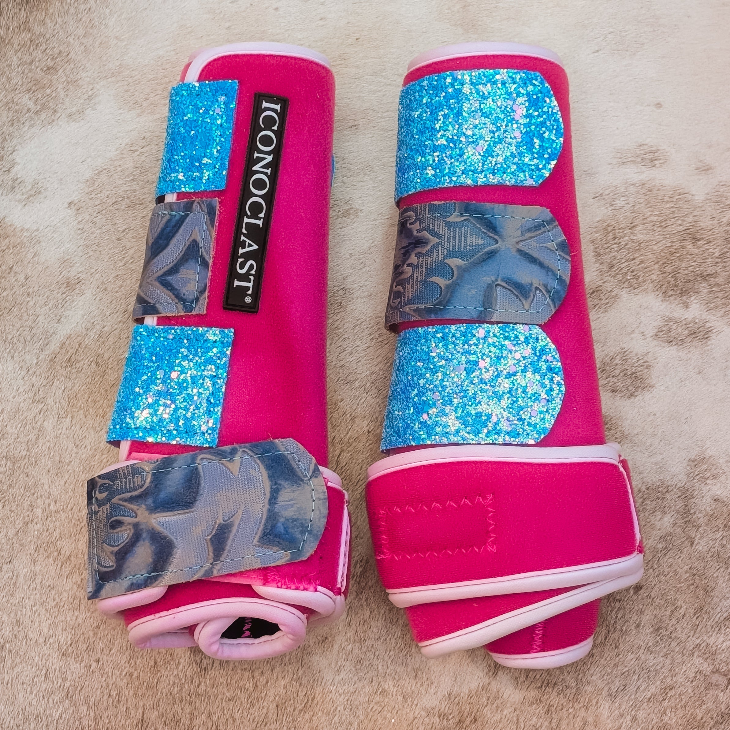 Medium Pink Dyed Iconoclast Fronts w/ Blue Laredo Leather and Light Blue Glitter Straps