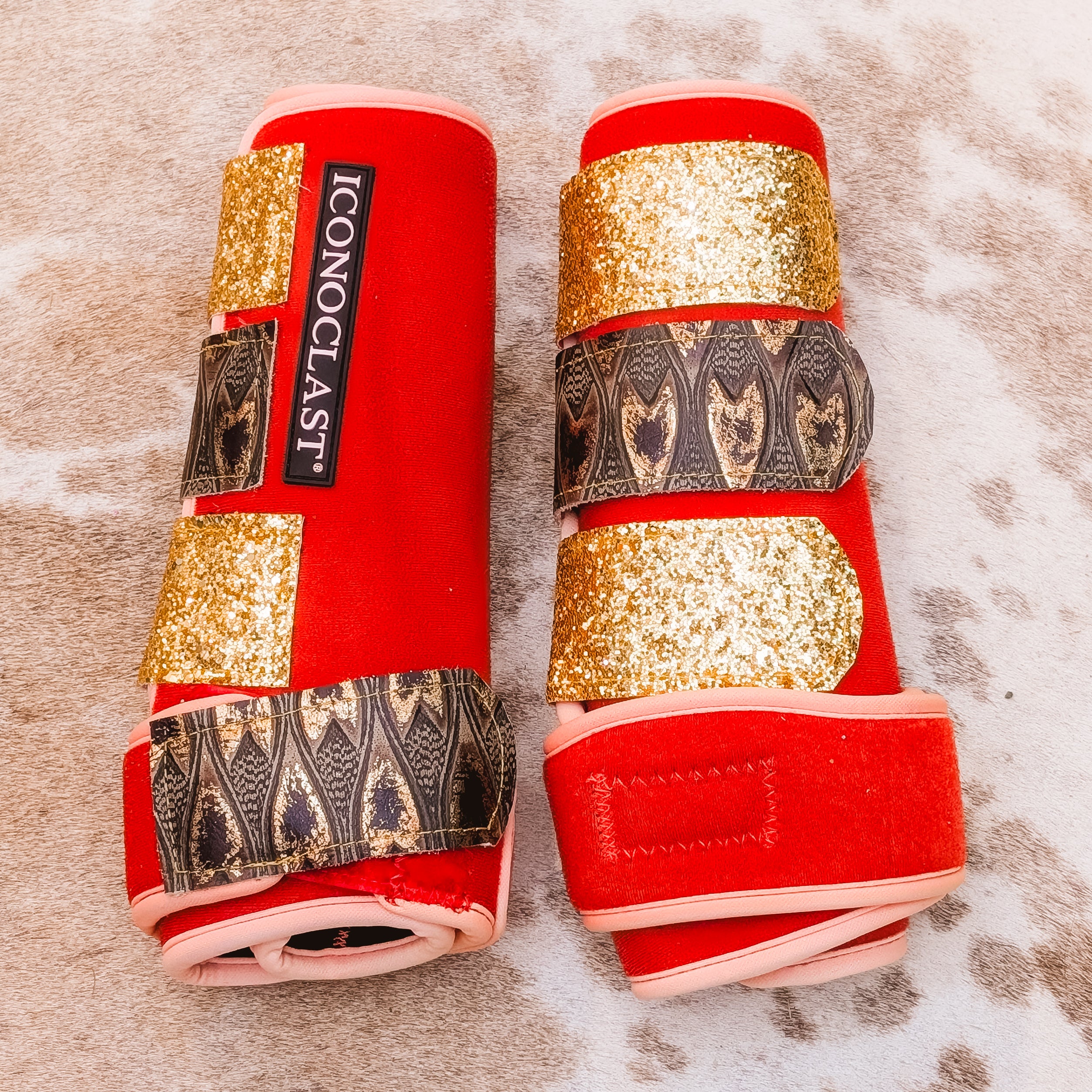 Large Red Dyed Iconoclast Fronts w/ Dragonscale Leather and Gold Glitter Straps