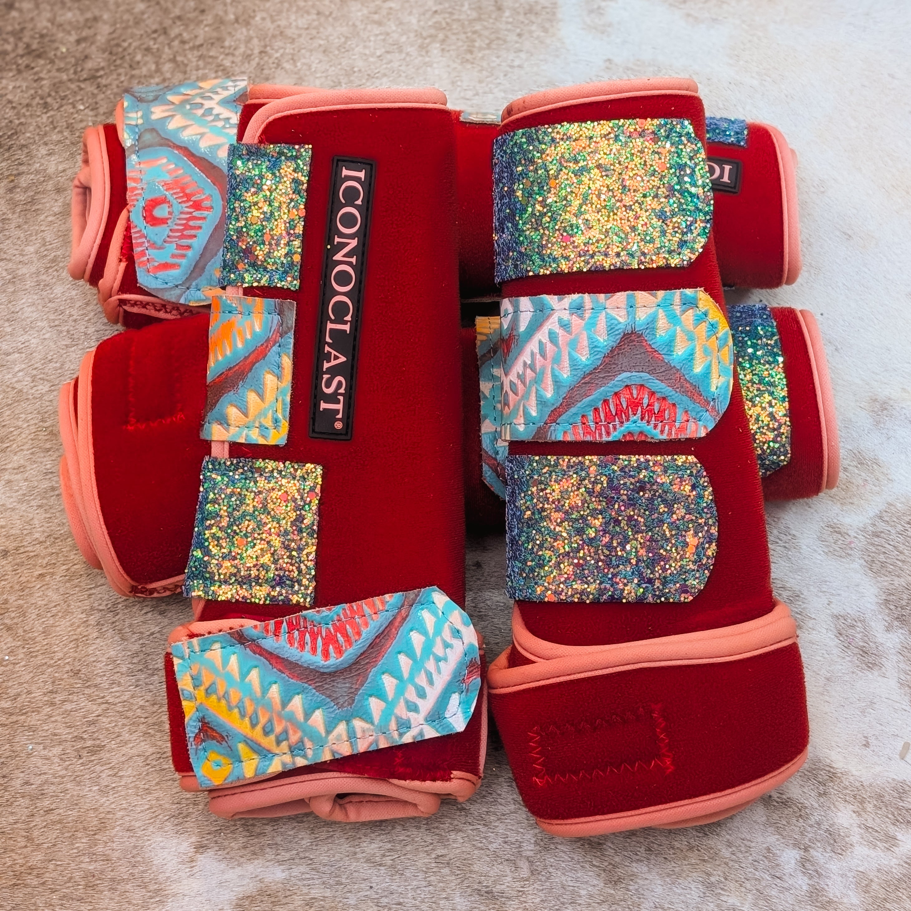 Medium Red Dyed Iconoclast Fronts & Hinds w/ Multi Aztec Leather and Dragonscale Glitter Straps