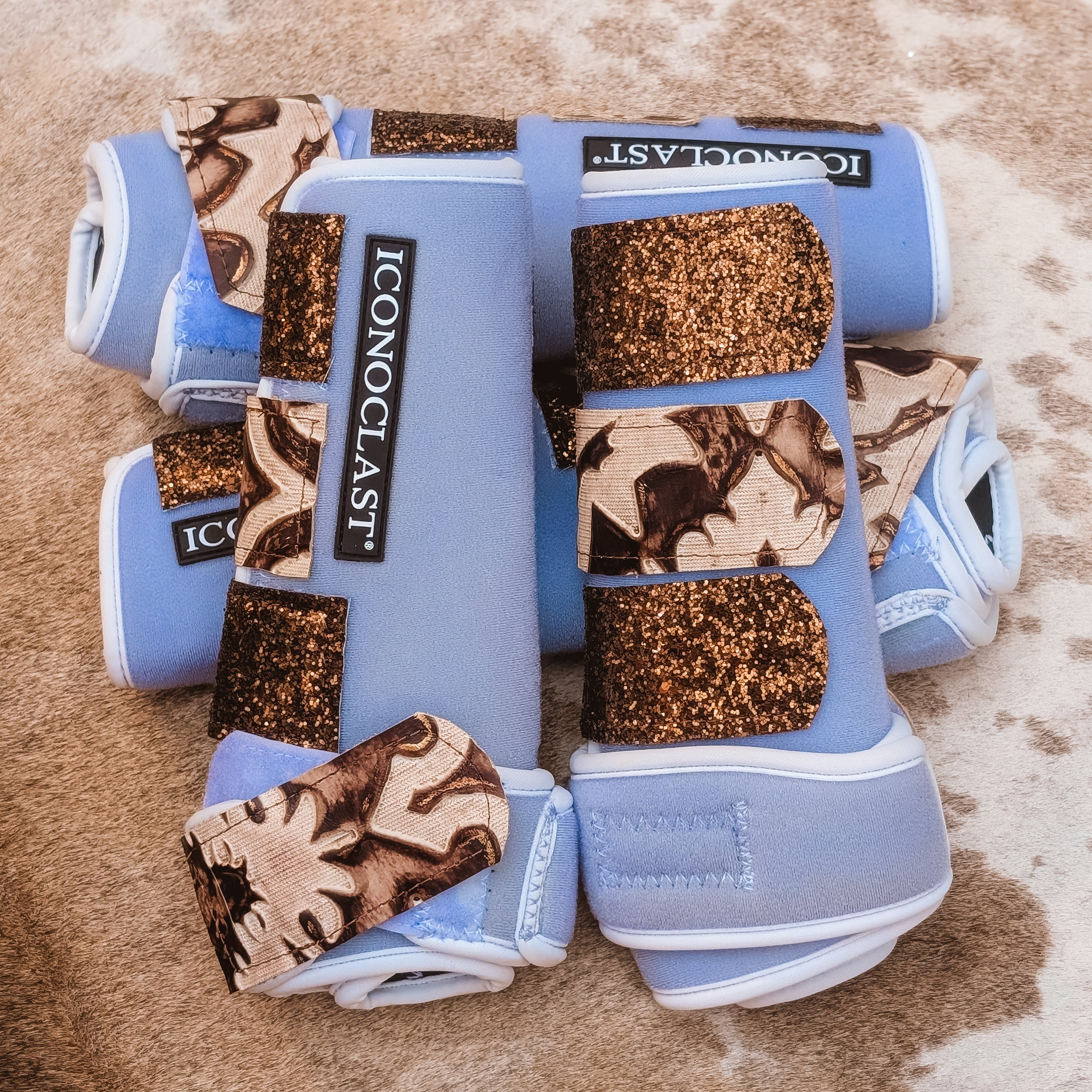Medium Blue Dyed Iconoclast Fronts & Hinds w/ Brown Cowskull Leather and Brown Glitter Straps