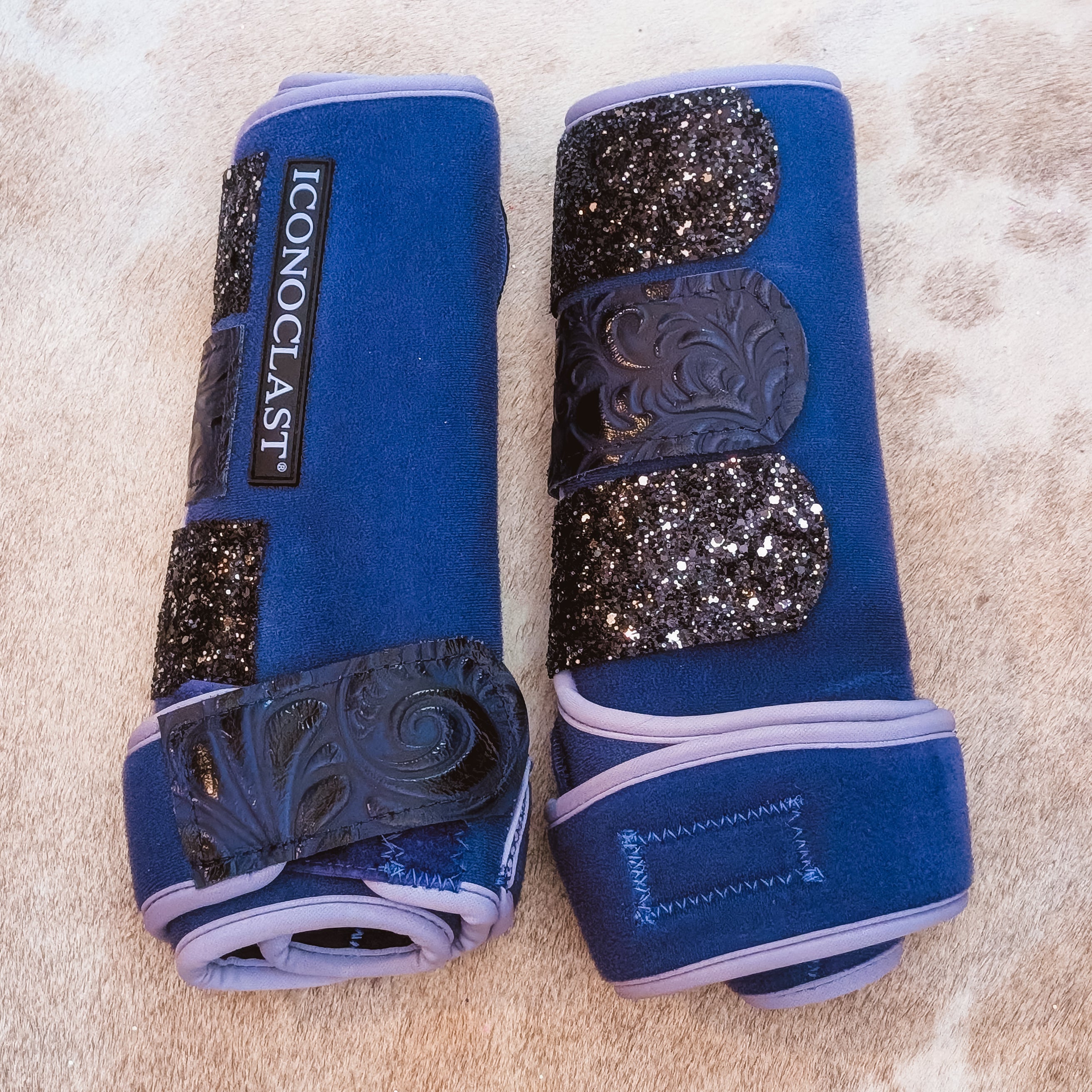 Large Navy Dyed Iconoclast Fronts w/ Navy Swirl Leather and Black Glitter Straps