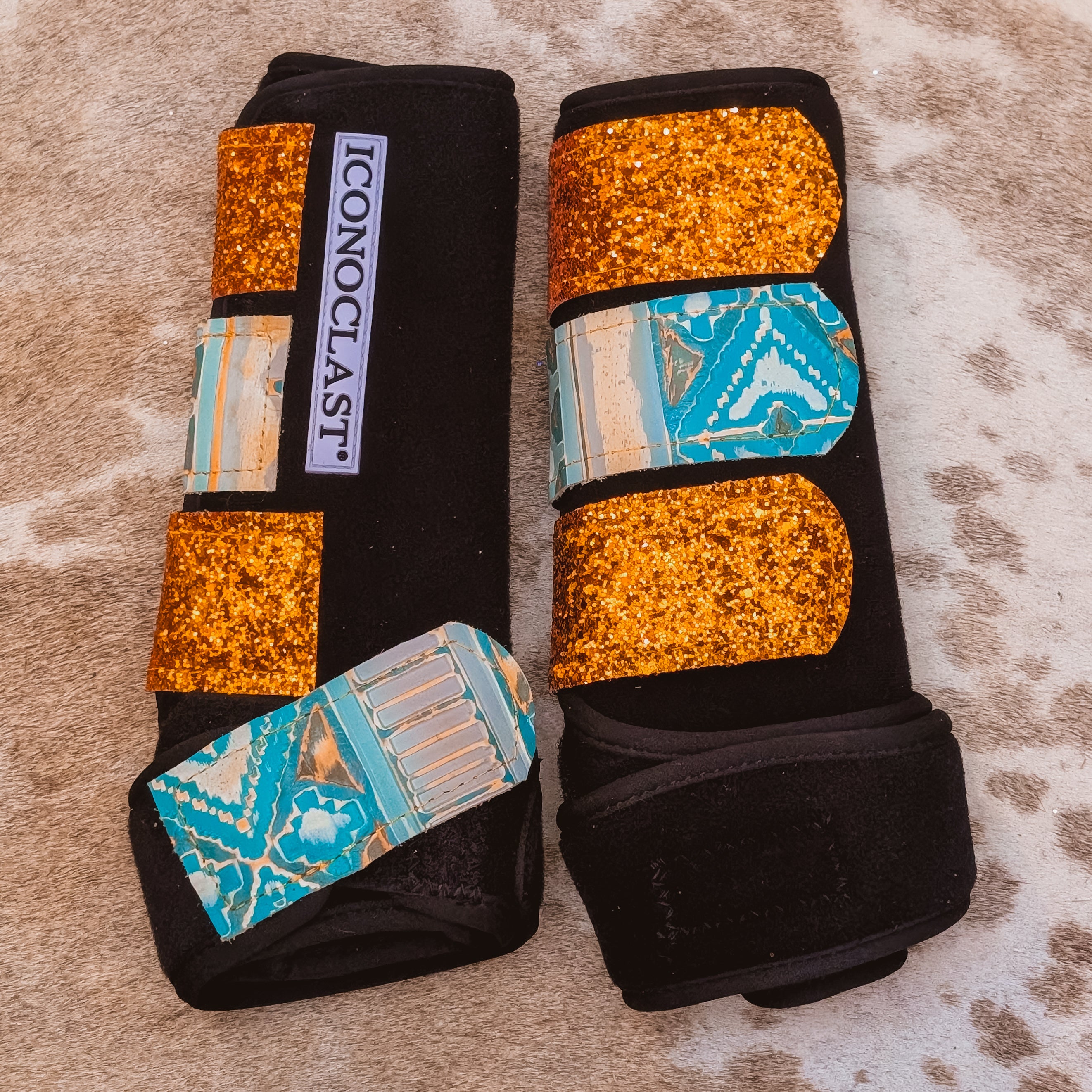 Small Turquoise Dyed Iconoclast Fronts w/ Boho Cow and Gold Confetti Glitter Straps