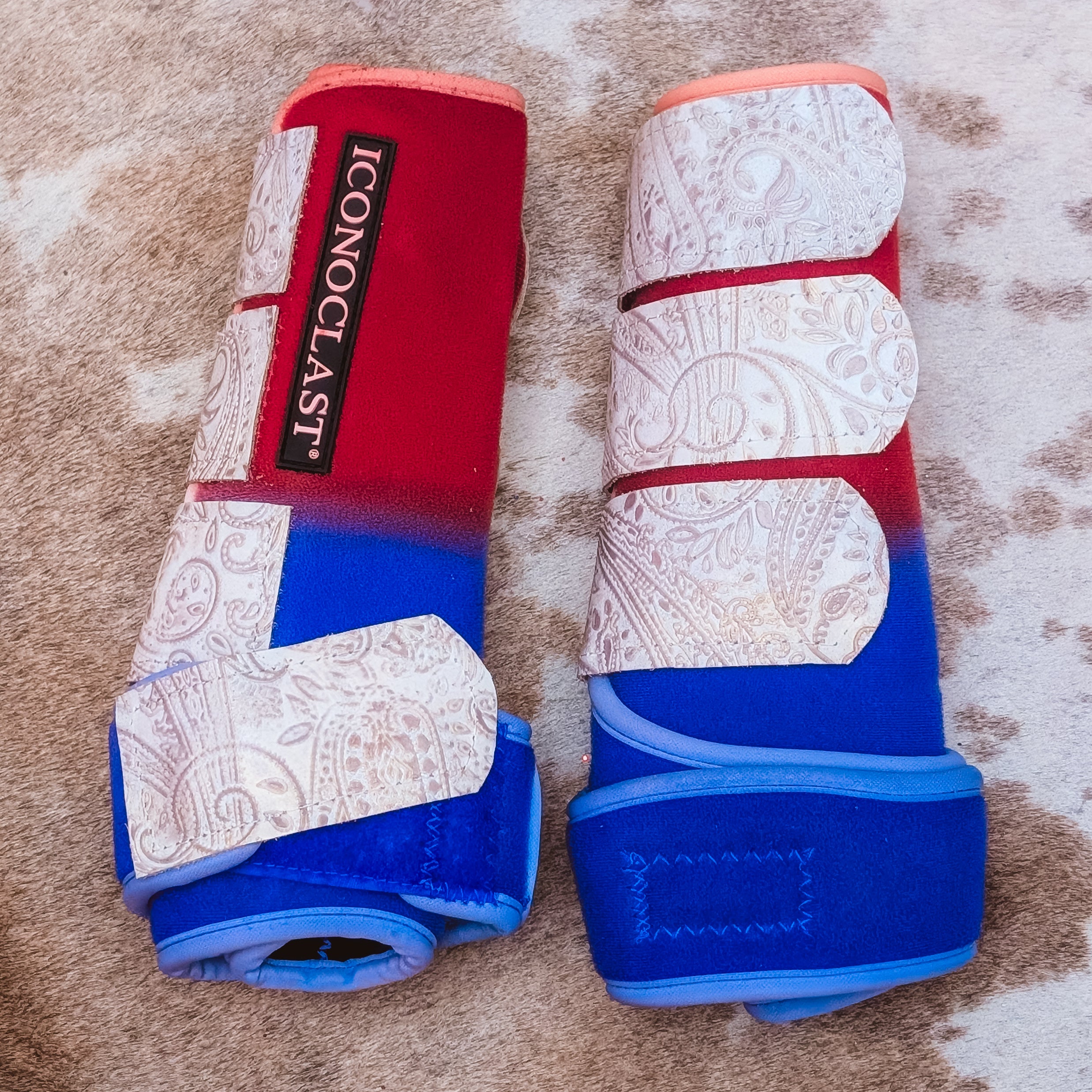 Large Red to Blue Double Dyed Iconoclast Fronts w/ White Filigree Leather Straps