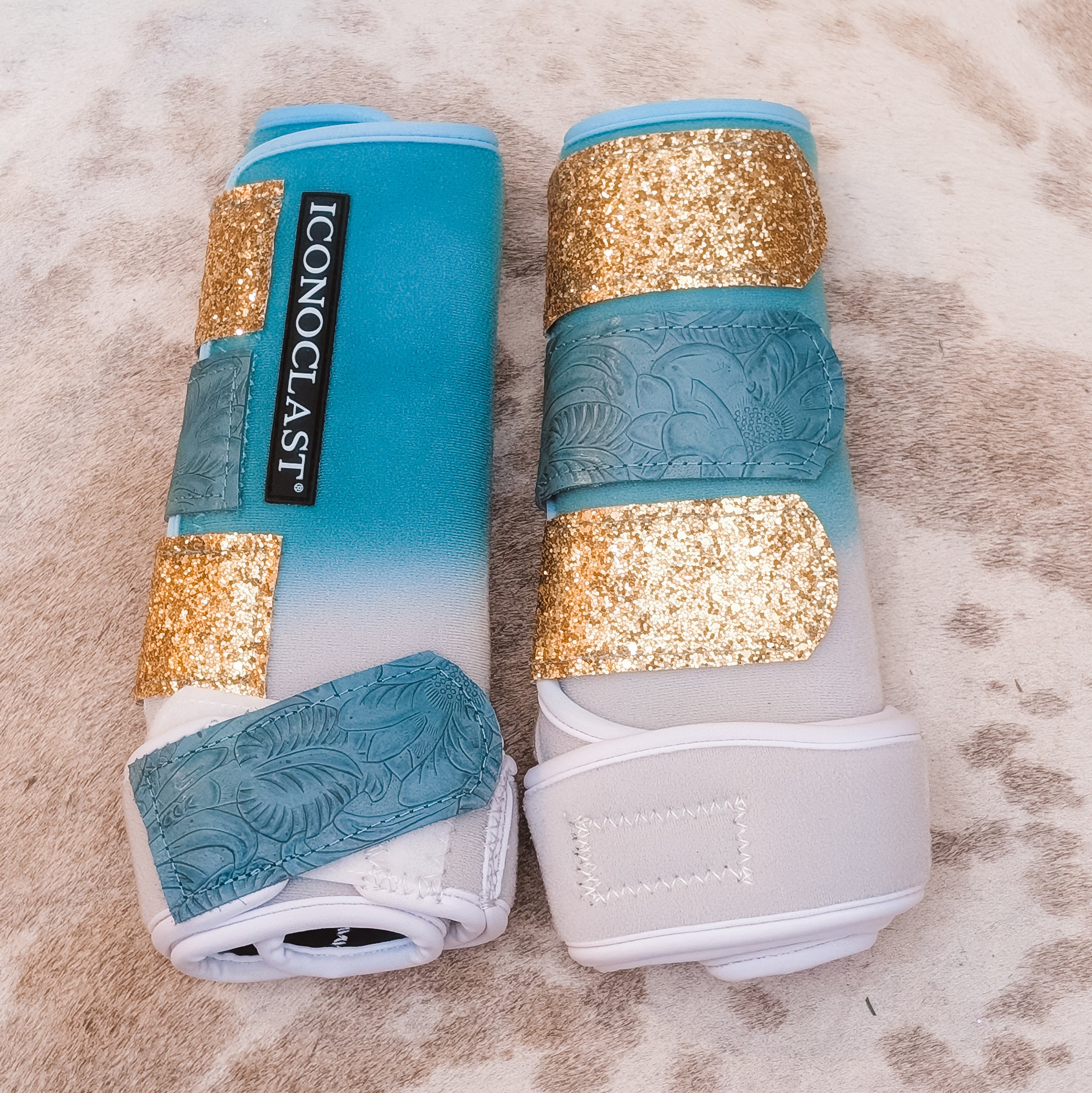 Large Turquoise Dip Dyed Iconoclast Fronts w/ Turquoise Floral Leather and Gold Glitter Straps