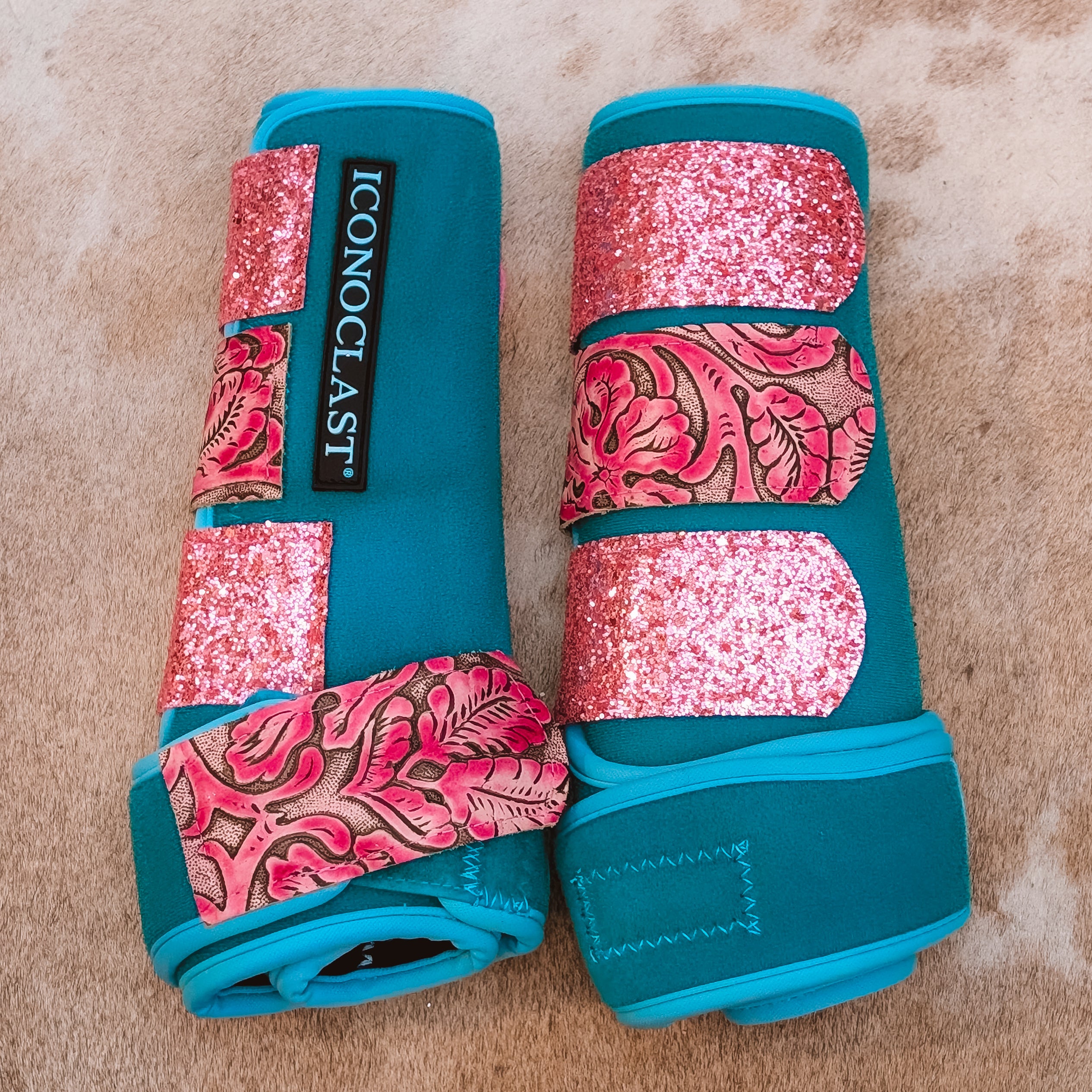 Large Turquoise Dyed Iconoclast Fronts w/ Pink Filigree Leather and Light Pink Glitter Straps