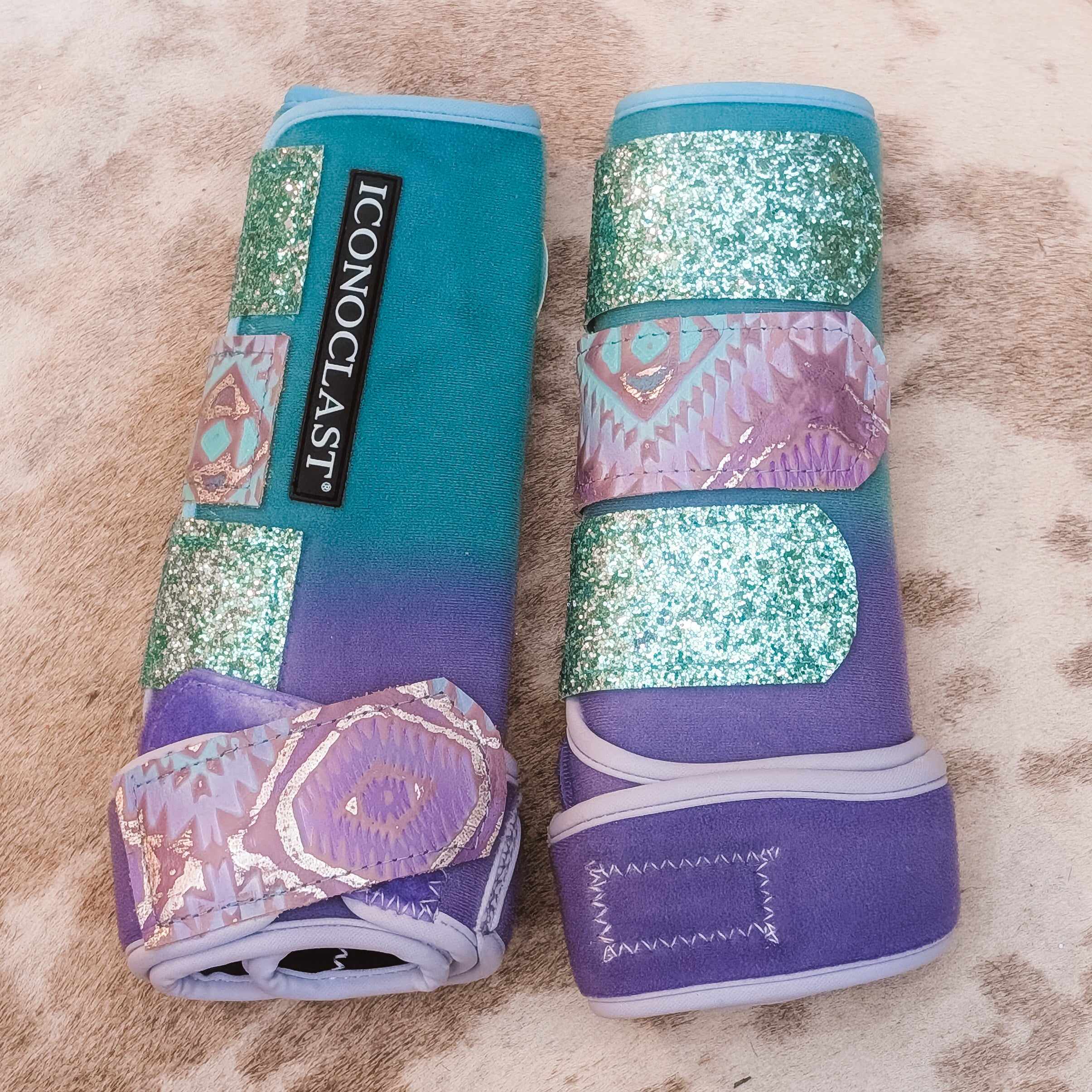 Large Turquoise to Lavender Double Dyed Iconoclast Fronts w/ Lavender Aztec Leather and Mint Glitter Straps