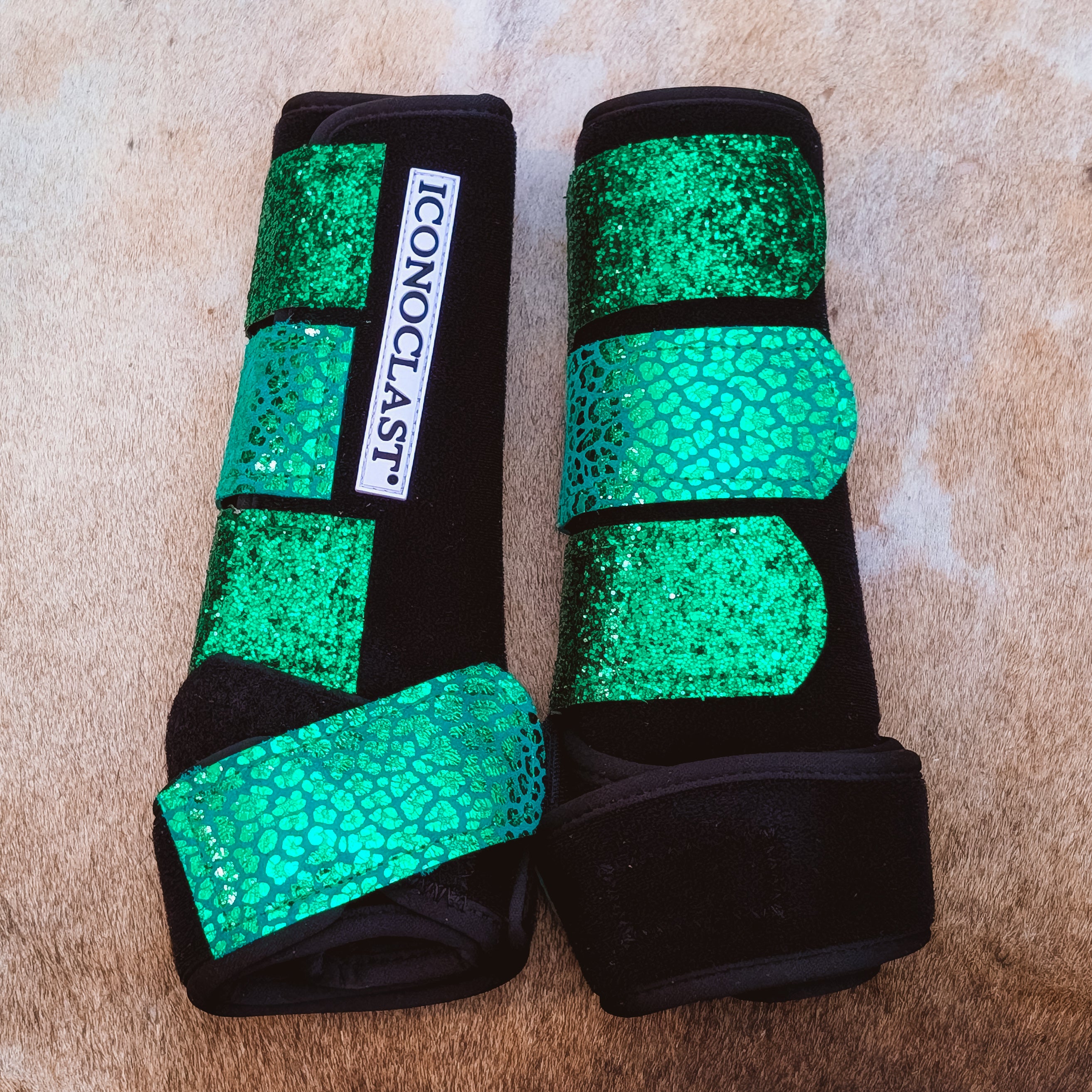 Medium Black Iconoclast Fronts w/ Green Holo Cheetah and Green Glitter Straps