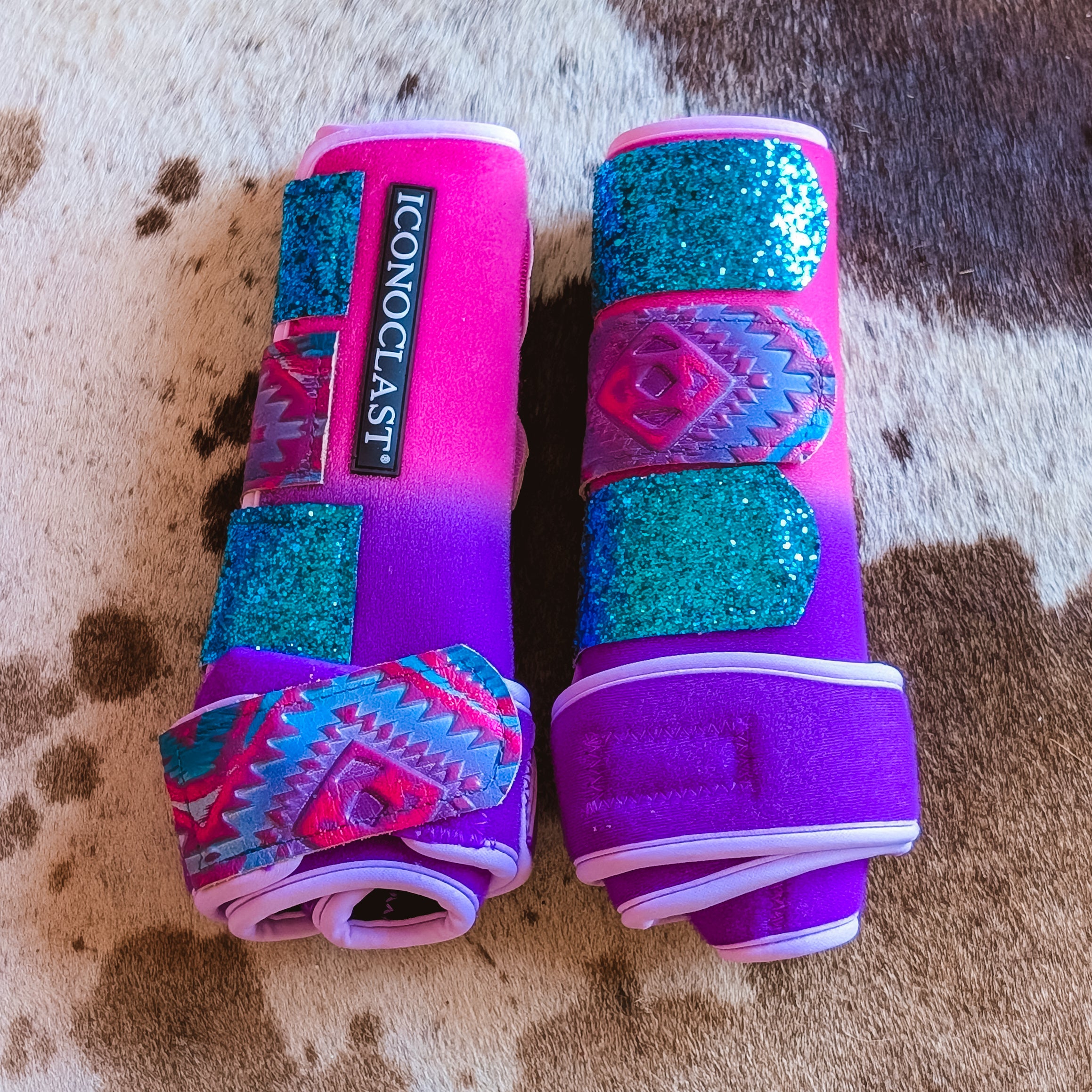 Medium Pink to Purple Double Dyed Iconoclast Fronts w/ Pink Aztec Leather and Turquoise Glitter Straps