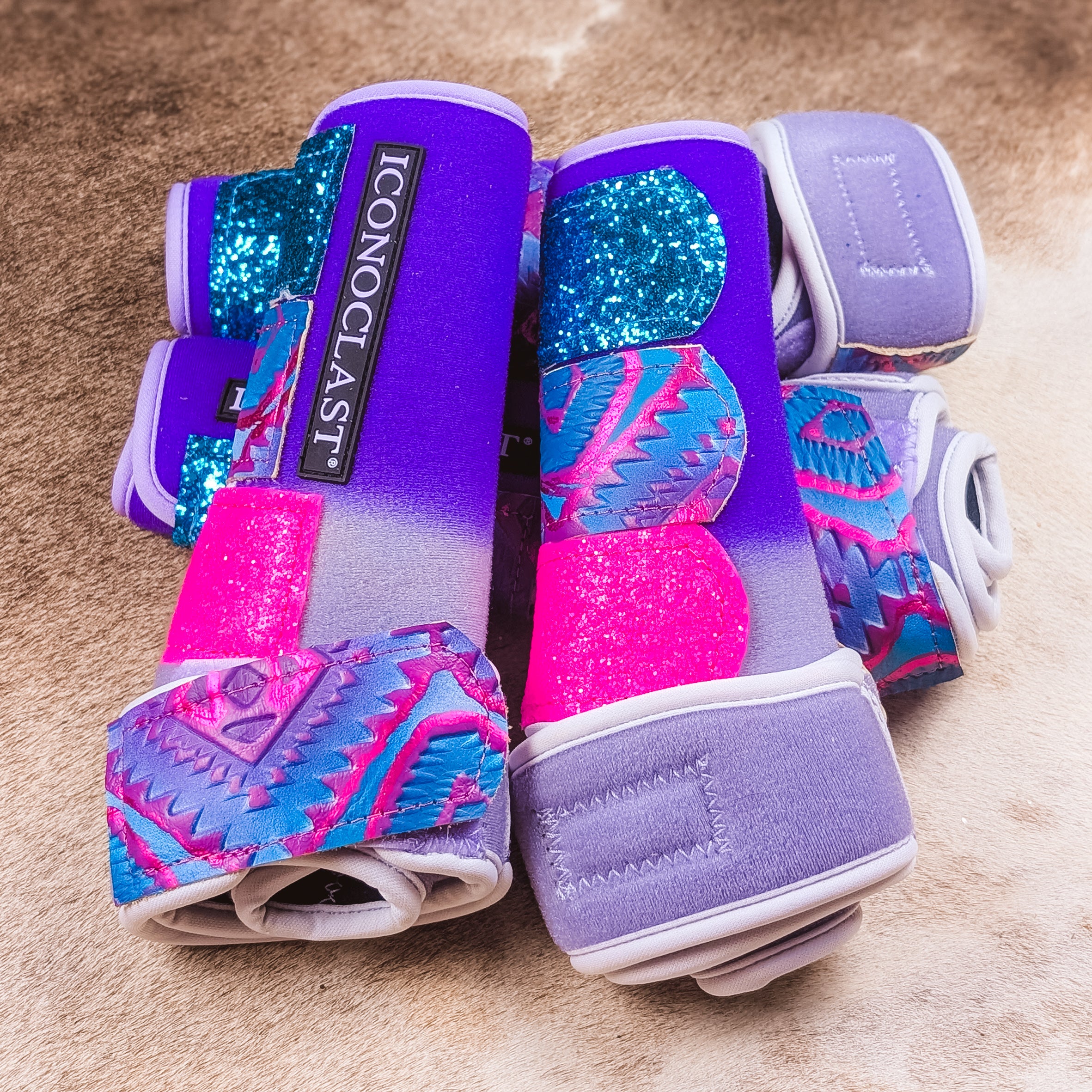 Small Purple to Lavender Double Dyed Iconoclast Fronts & Hinds w/ Pink Aztec Leather and Turquoise/Pink Glitter Straps