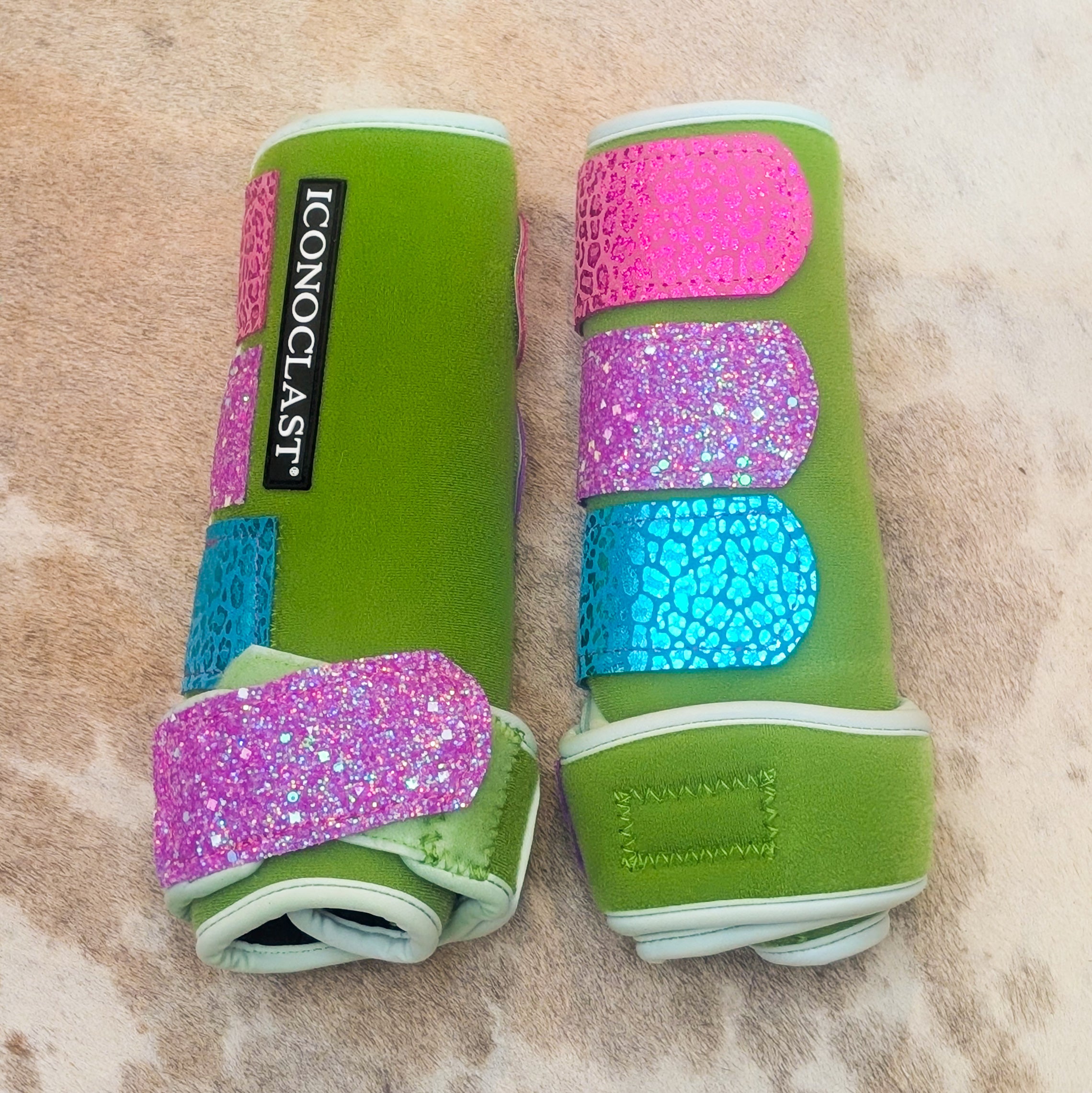Medium Lime Green Dyed Iconoclast Fronts w/ Pink/Turquoise Holo Cheetah Leather and Neon Purple Glitter Straps