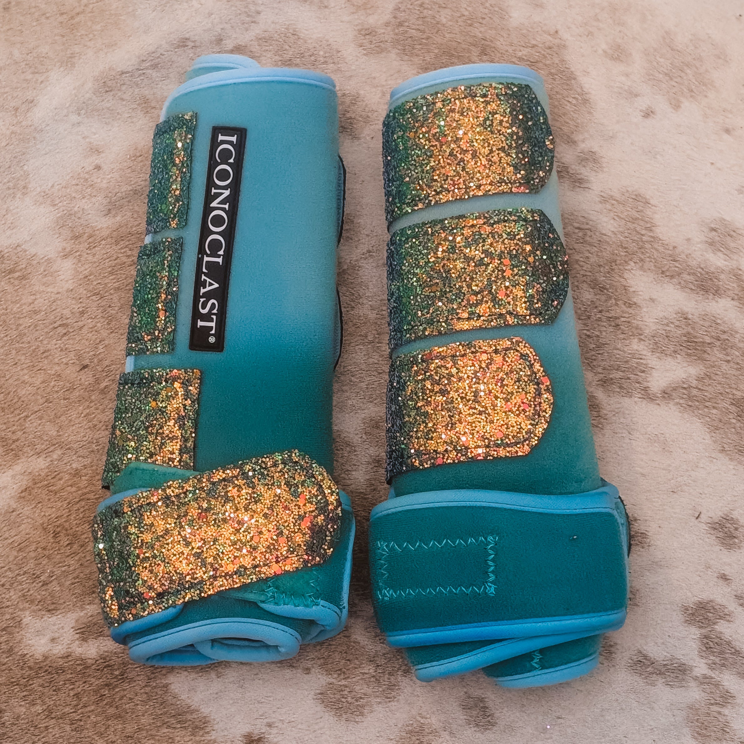 Large Turquoise Dip Dyed Iconoclast Fronts w/ Turquoise Floral Leather and Gold Glitter Straps