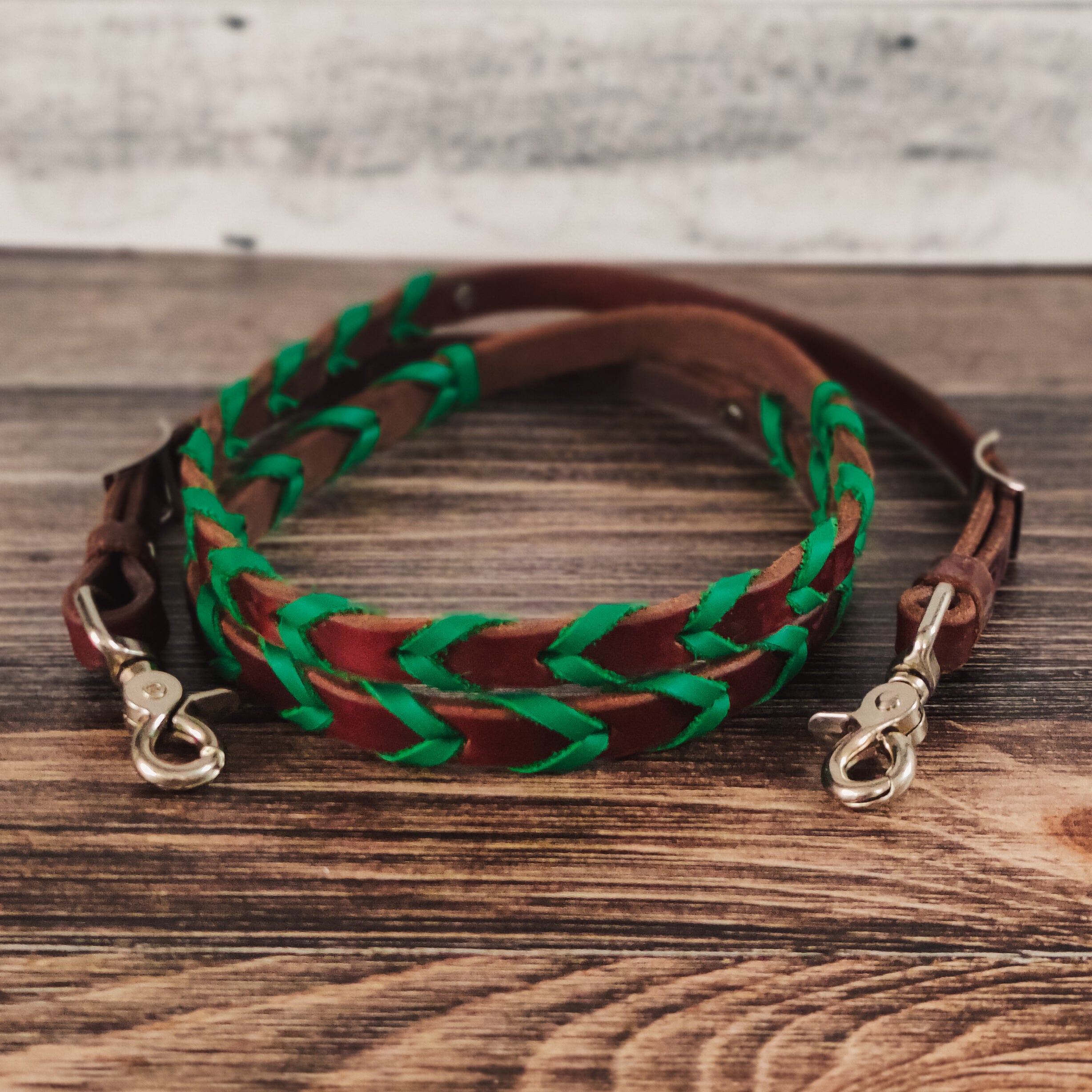 Add a coordinating pop of color to finish out your tack set with these gorgeous leather reins. Made in the USA using high quality harness leather, these reins have a fantastic, supple feel. All laced reins are laced with leather lacing, not paracord. All laced reins have clips on the end to easily swap between headstalls.