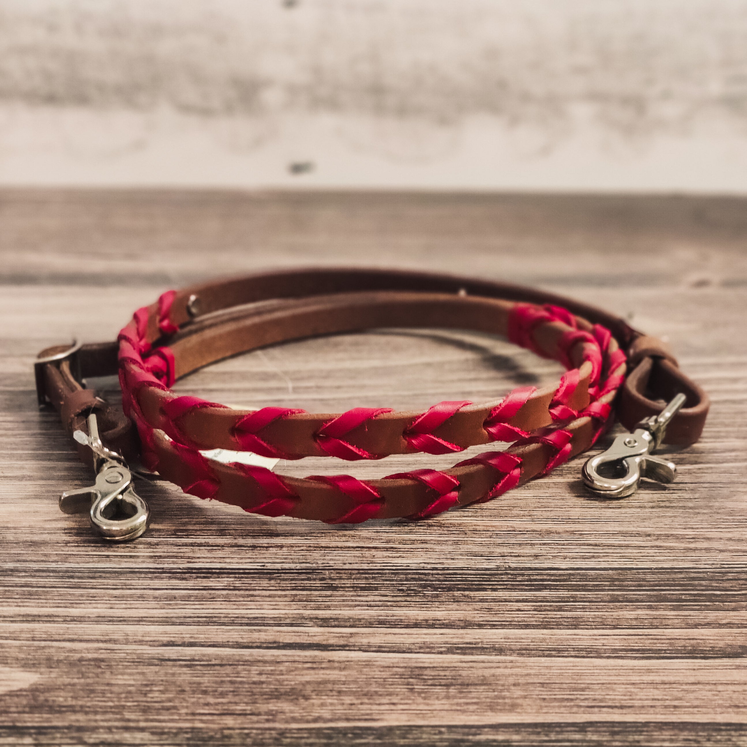 Complete your tack set with a touch of coordinated color using our exquisite leather reins. Expertly crafted in the USA from premium harness leather, these reins boast a remarkable supple feel and unmatched quality. Rest assured, our laced reins feature genuine leather lacing, providing superior durability and aesthetics. Additionally, the reins are equipped with convenient clips on the ends, allowing for effortless swapping between headstalls. Elevate your riding experience with these stunning leather reins that combine style, craftsmanship, and practicality.