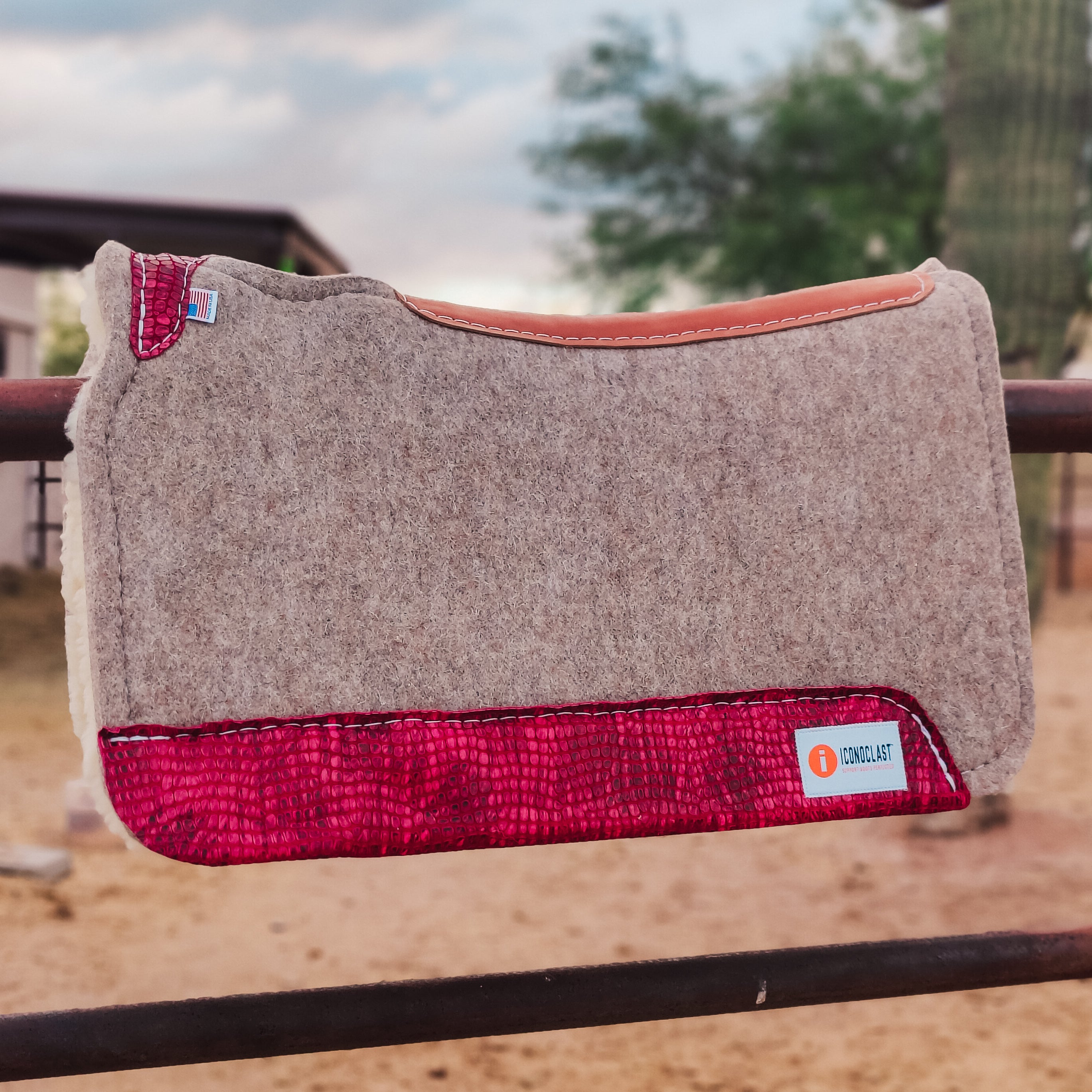 Looking for a high quality saddle pad in a mid quality price range while still buying American made? Made of 1" thick wool felt with a fleece underside, these pads form to the horse's back while wicking away sweat and allowing the back to breathe. As an added bonus they have cutouts for wither relief and the cinch. We are the ONLY retailer able to offer Iconoclast pads with custom wear leather and length options.