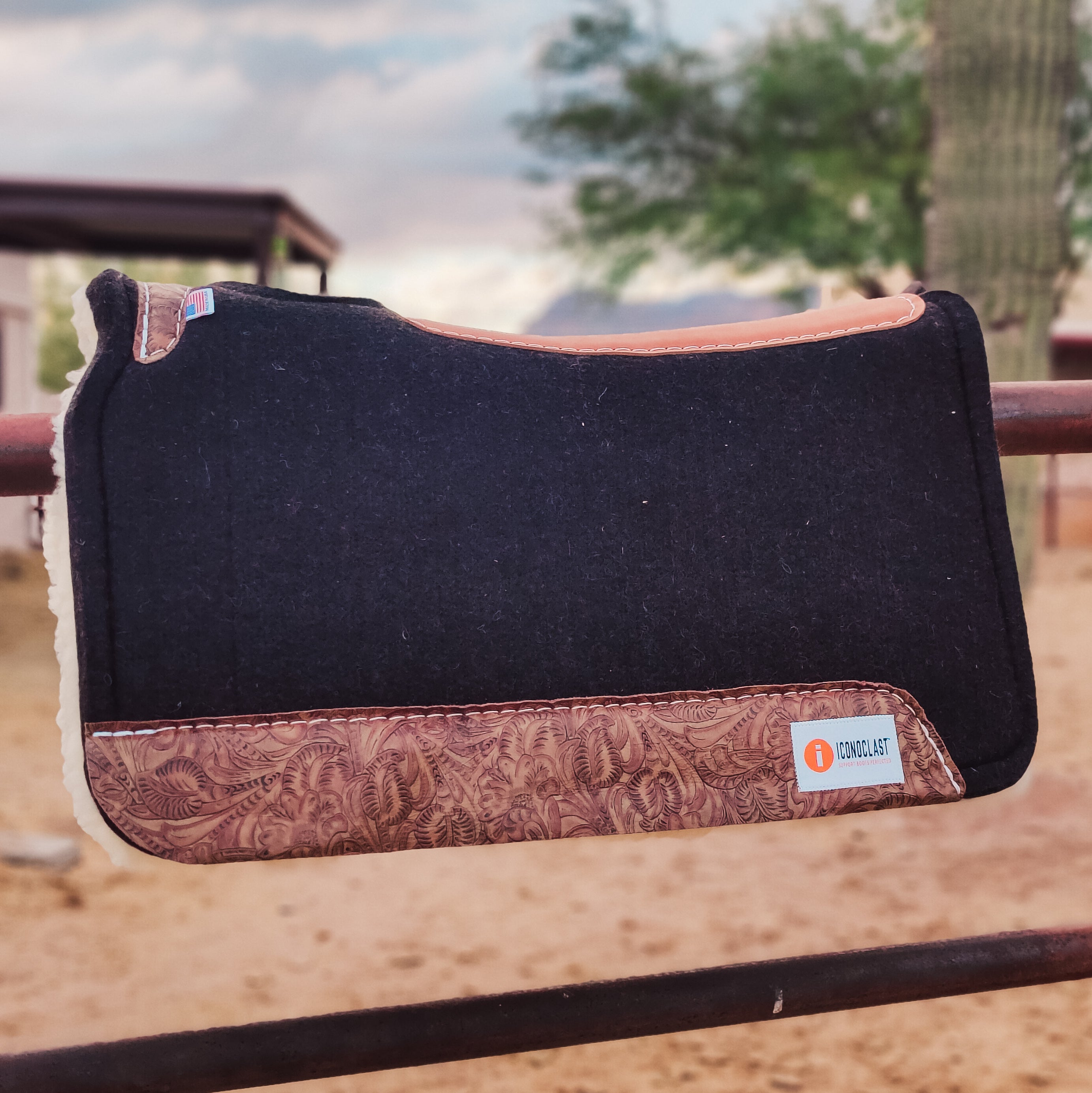 Looking for a high quality saddle pad in a mid quality price range while still buying American made? Made of 1" thick wool felt with a fleece underside, these pads form to the horse's back while wicking away sweat and allowing the back to breathe. As an added bonus they have cutouts for wither relief and the cinch. We are the ONLY retailer able to offer Iconoclast pads with custom wear leather and length options.