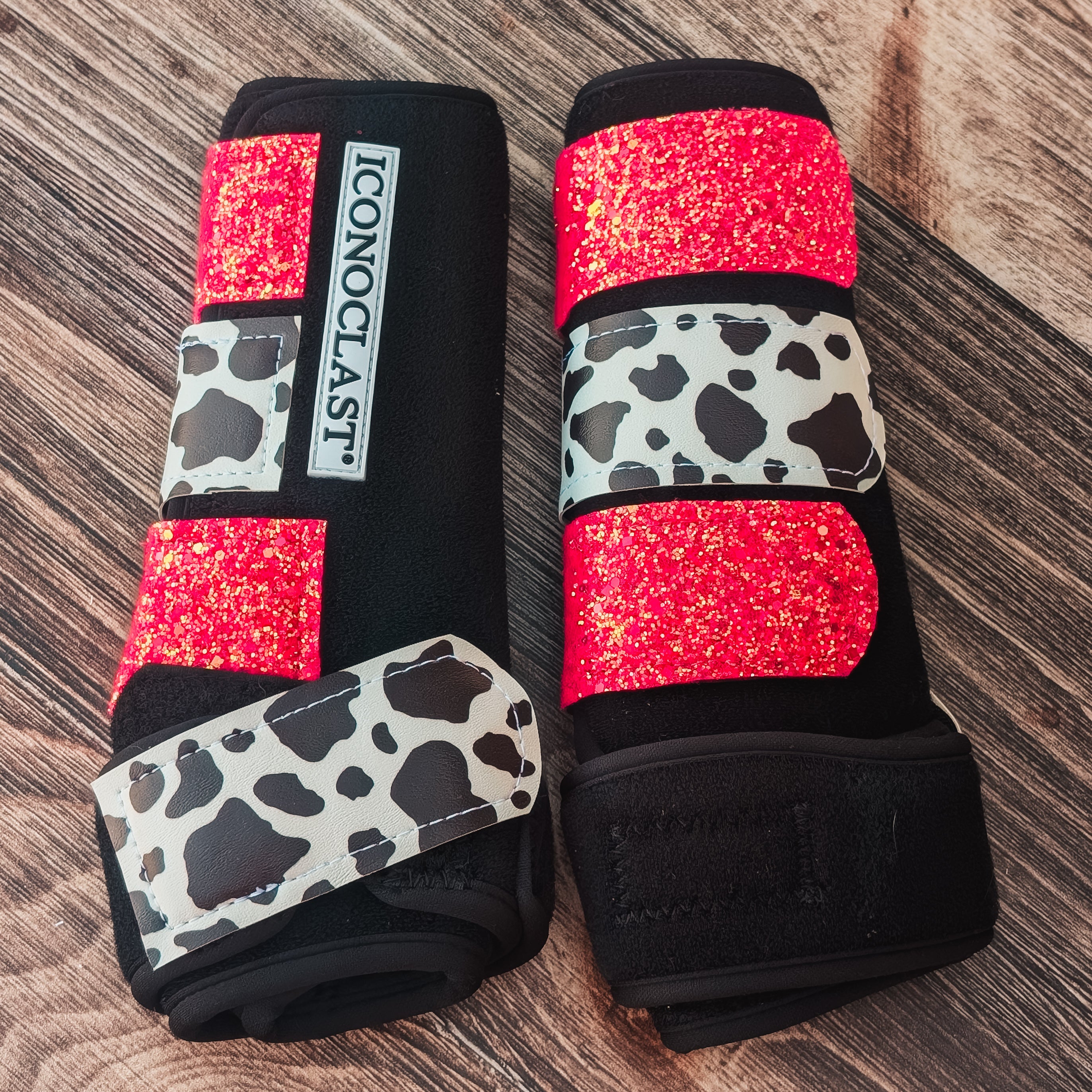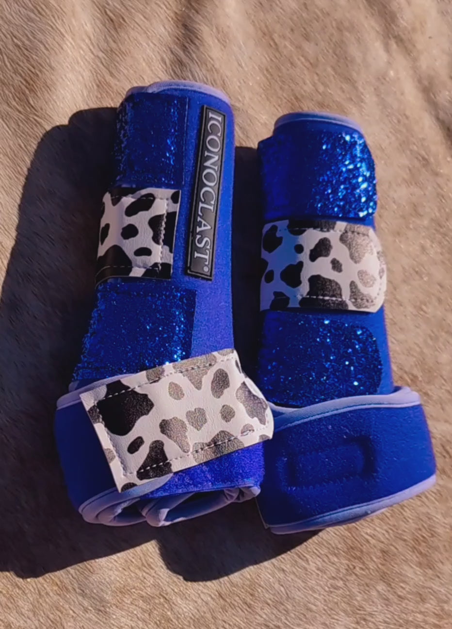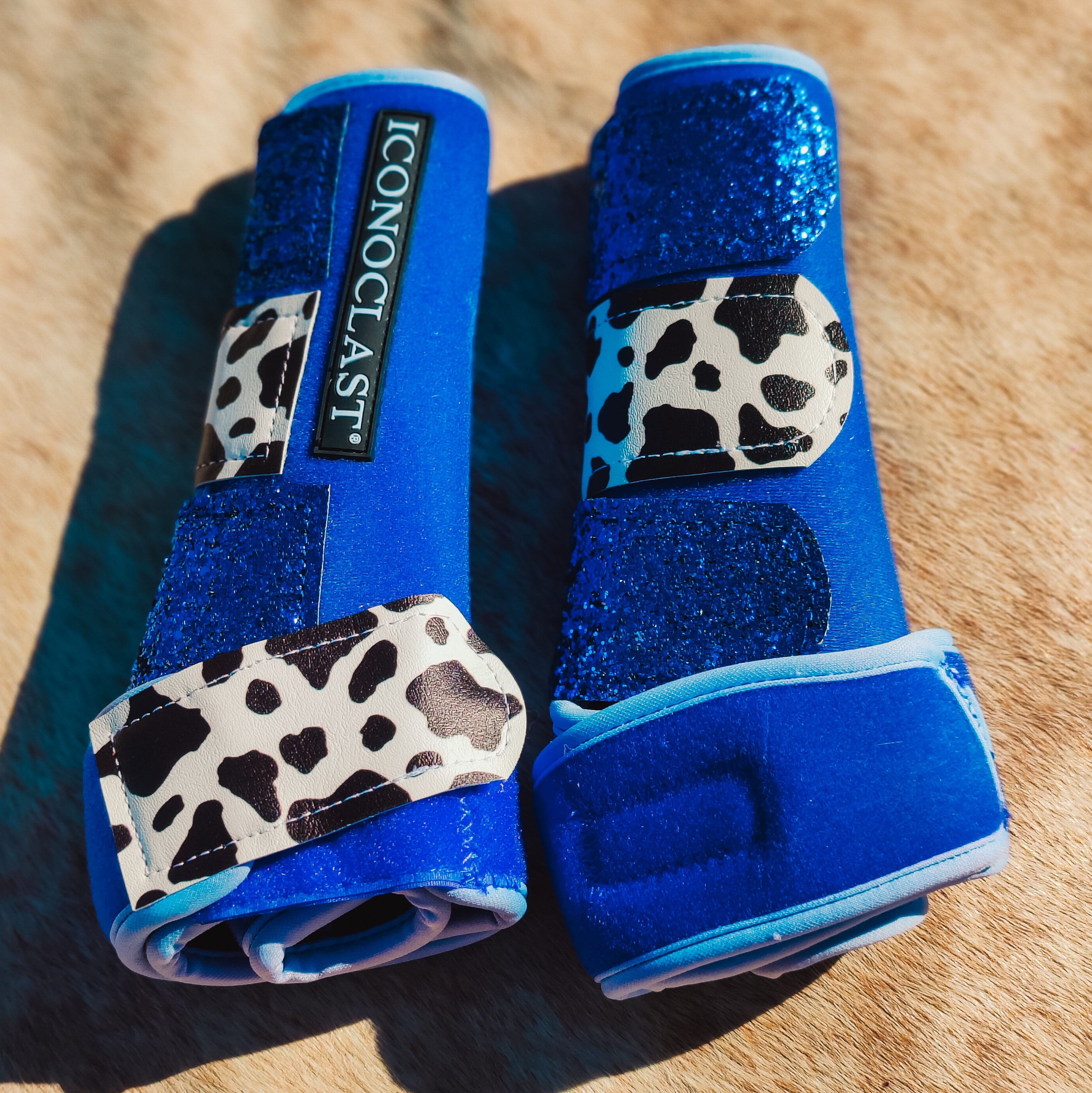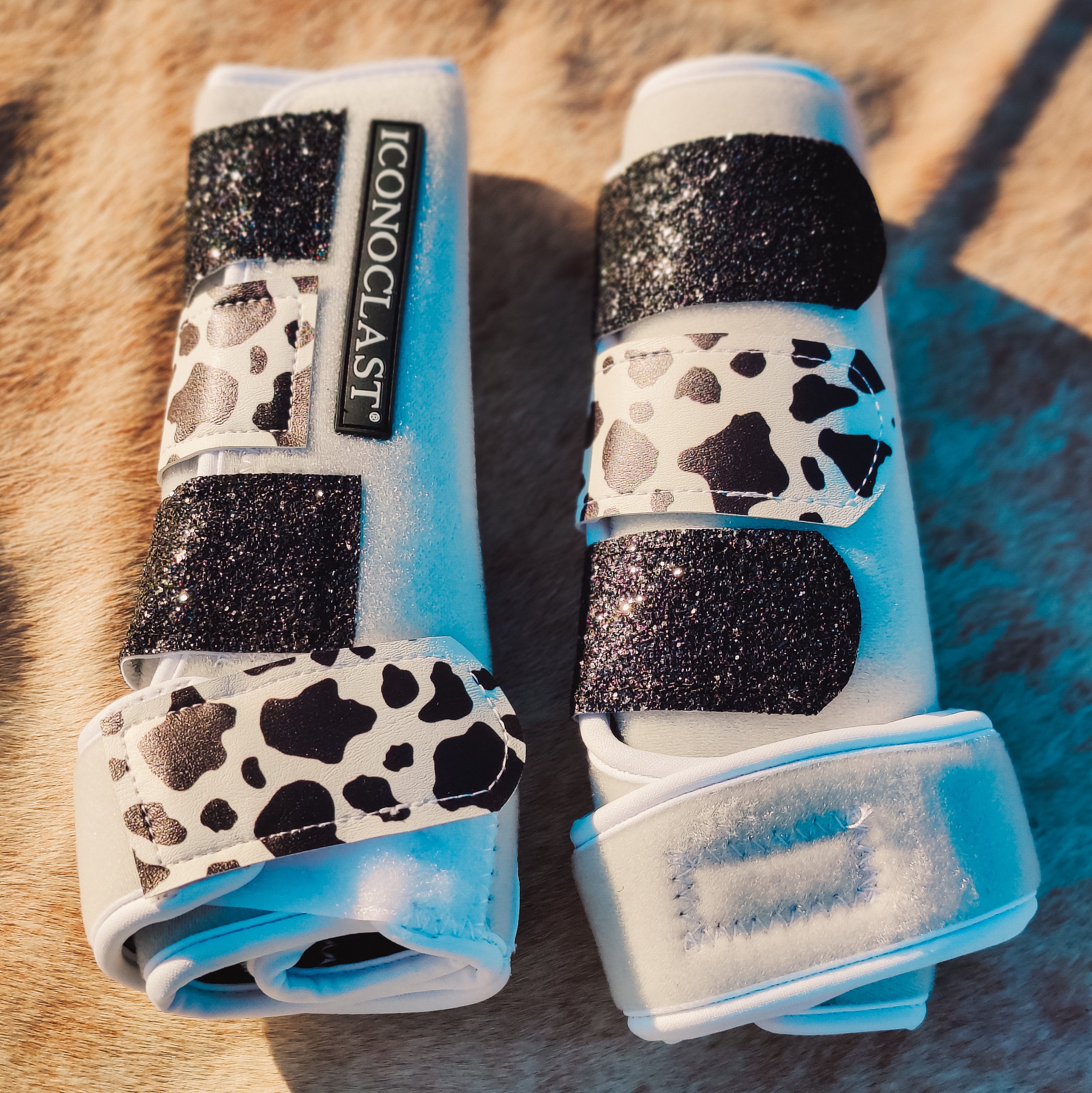Why do we love faux leather straps? It's easy! They are simple to maintain and look good. They are glued and sewn for durability. These can handle whatever conditions you throw at them. Mud? No problem, just hose them off. Deep red sand? Again just hose them off ;) (be warned it may stain any white areas). Puddles of water? Wipe them off, hang them to dry, and move on with your day. Faux leather is our preference for gorgeous, durable boots that last. Craving some extra sparkle? Choose to alternate with your favorite color glitter leather so that your boots will shine under sunlight and arena lights.