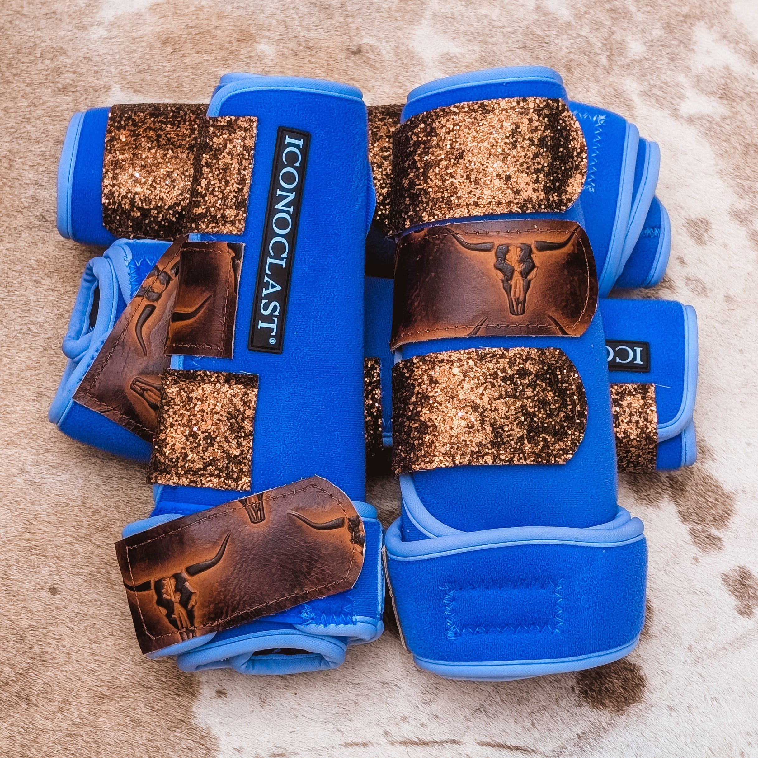 Why do we think leather boots are a must have? They scream classy cowgirl. All of our leather strap boots are glued and sewn for durability. While they do require some basic maintenance like all your other leather tack, they are more than worth it. Our gorgeous leather options are all embossed and either hand dyed or hand painted for a depth of design that you can only find in real leather. While we recommend not using these in muddy footing or puddles, if you do find yourself using them in these conditions hose them off, hang them to air dry, and condition them with leather conditioner.
