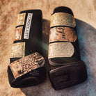 Why do we think leather boots are a must have? They scream classy cowgirl. All of our leather strap boots are glued and sewn for durability. While they do require some basic maintenance like all your other leather tack, they are more than worth it. Our gorgeous leather options are all embossed and either hand dyed or hand painted for a depth of design that you can only find in real leather. While we recommend not using these in muddy footing or puddles, if you do find yourself using them in these conditions hose them off, hang them to air dry, and condition them with leather conditioner to keep them in tip top shape.