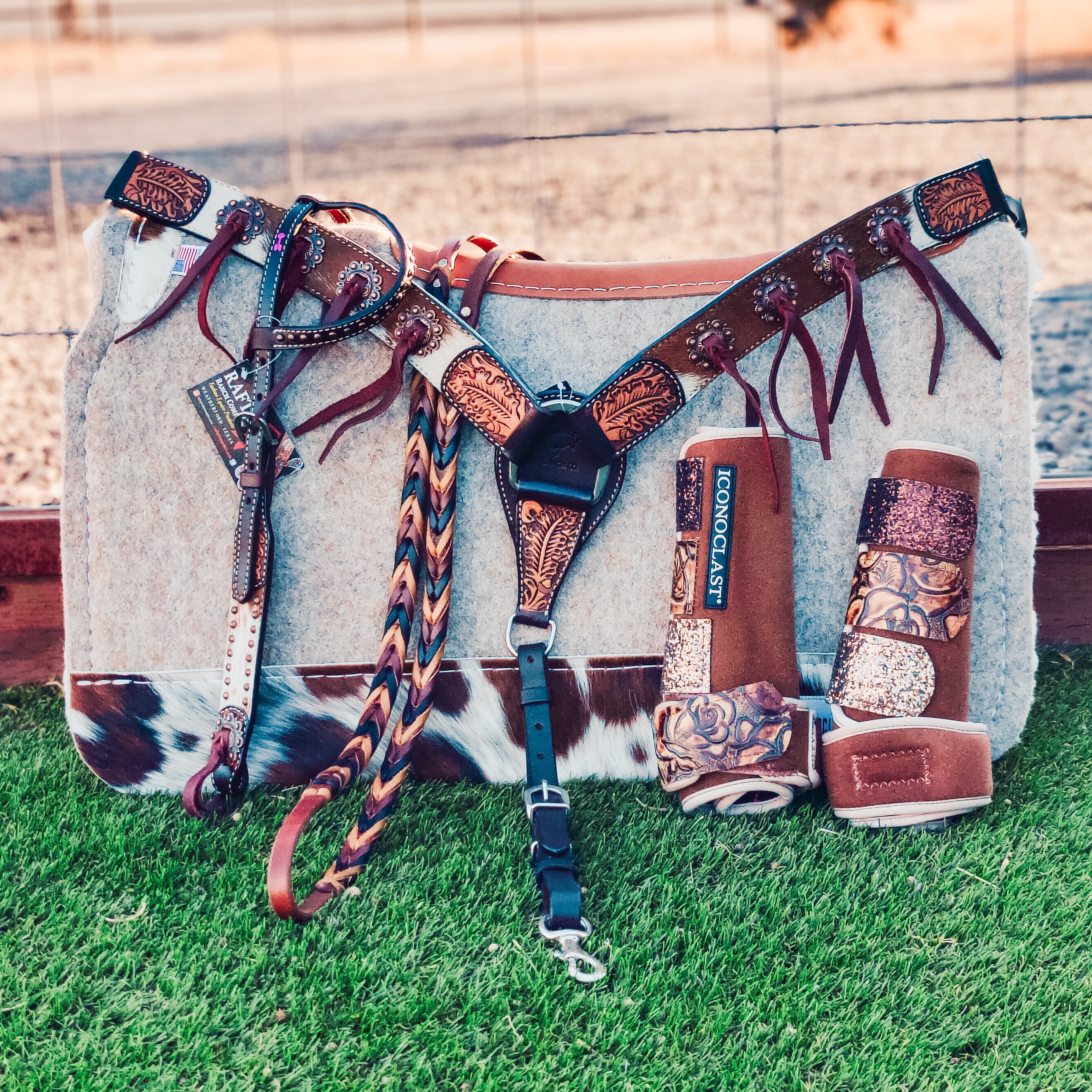 Note - The boots and reins are shown for demonstration only and are not included in a tack set purchase. They may be purchased separately.