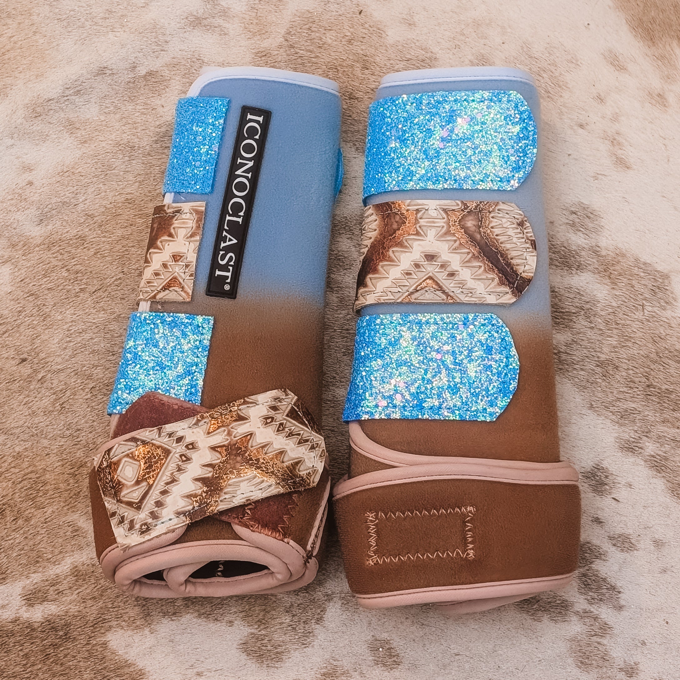 Large Light Blue to Brown Double Dyed Iconoclast Fronts w/ Brown Aztec Leather and Light Blue Glitter Straps