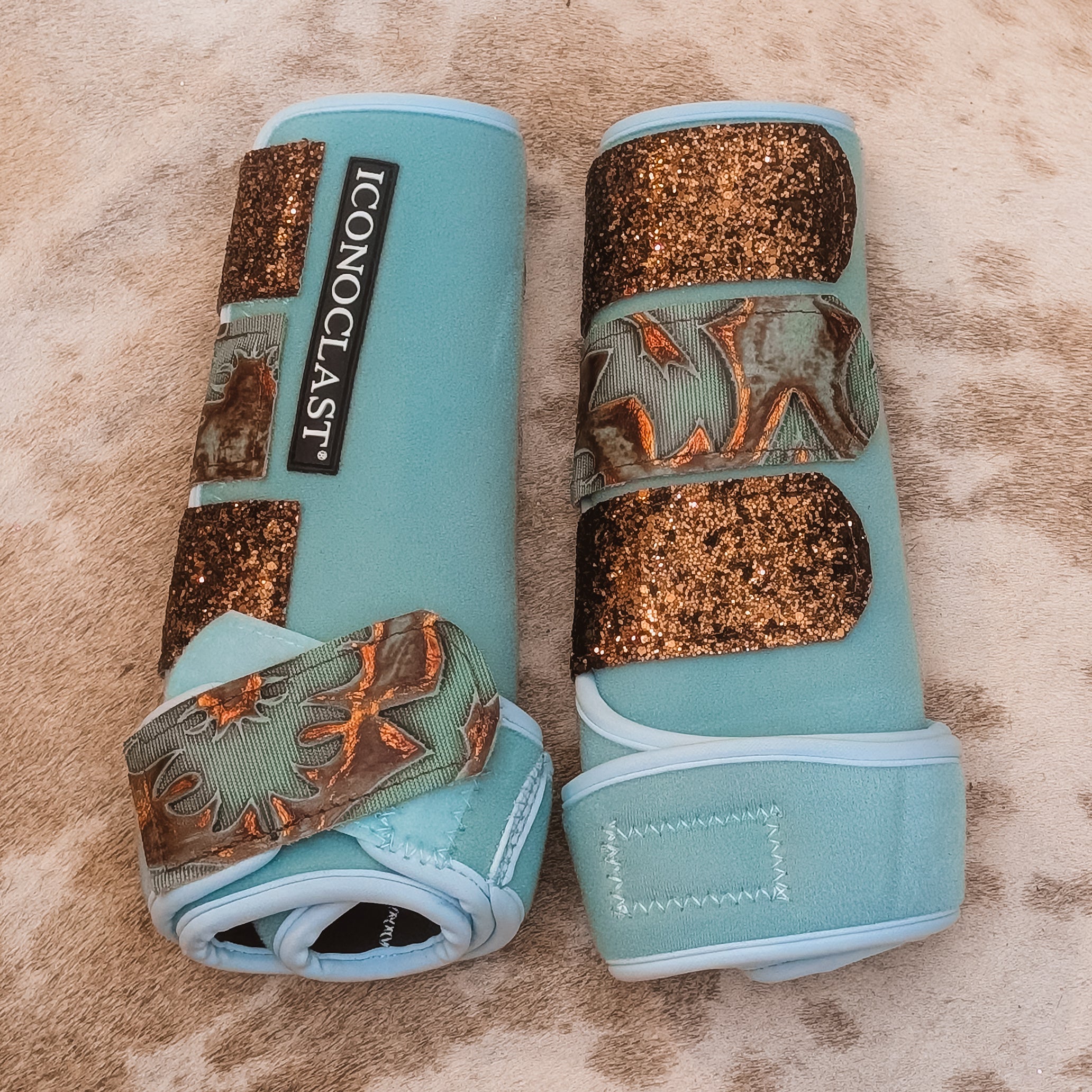 Large Mint Dyed Iconoclast Fronts w/ Turquoise Laredo Leather and Brown Glitter Straps